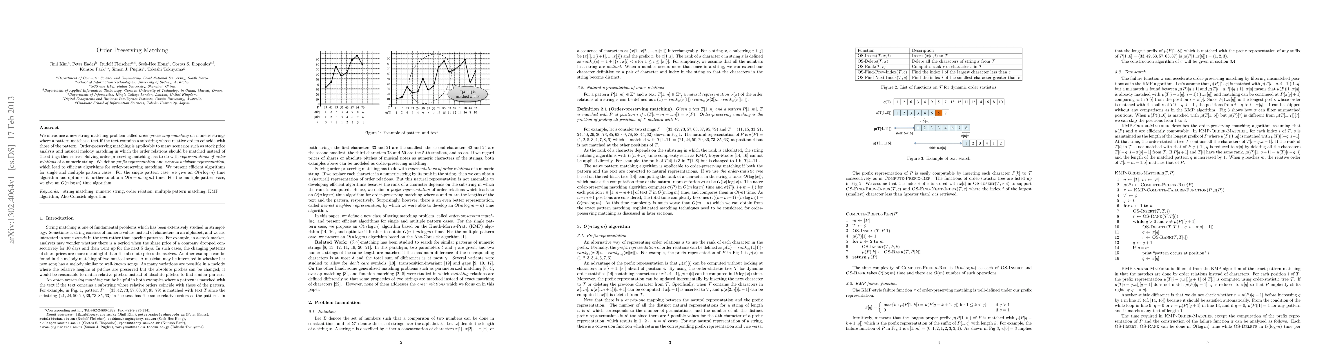 This paper introduces a novel string matching problem called order-preserving matching for numeric strings, focusing on matching based on relative order rather than exact string content. The authors propose efficient algorithms for both single and multiple pattern cases, achieving O(n + m log m) time for single patterns and O(n log m) for multiple patterns.