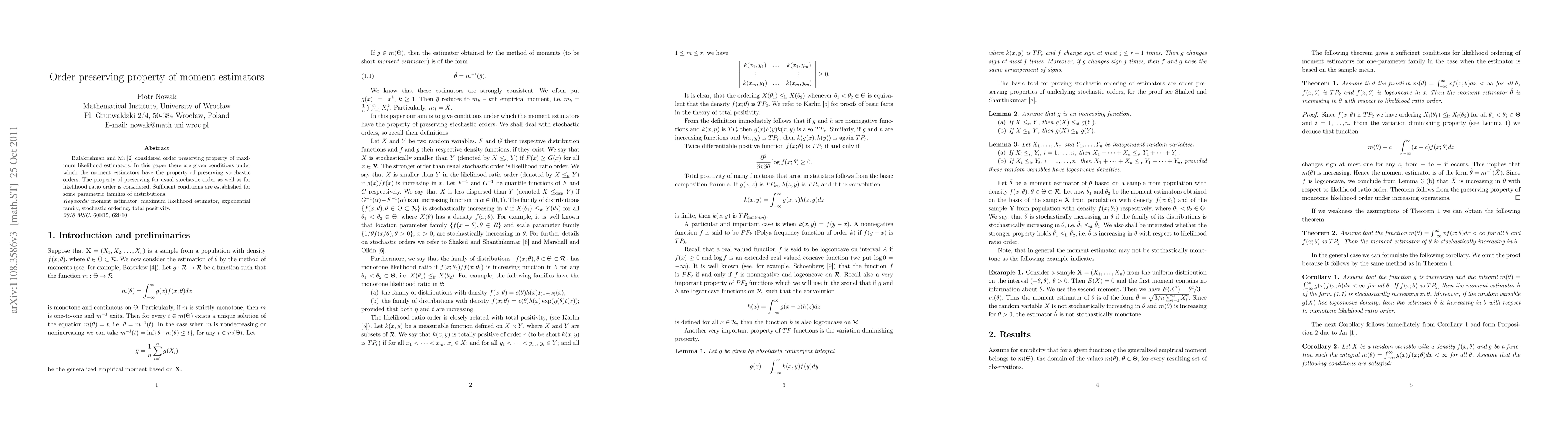 This paper shows that under certain conditions, moment estimators preserve order in stochastic orders, including likelihood ratio order, for specific families of distributions such as exponential, location, and scale families.