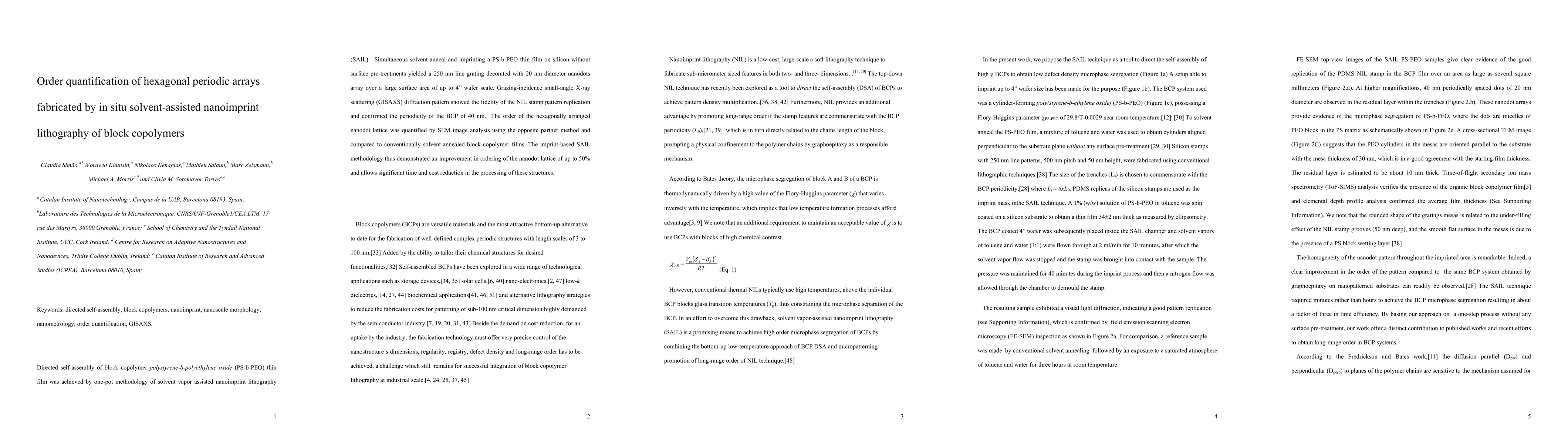 Summary: This study demonstrates a one-order quantization of hexagonal periodic arrays through solvent vapour-assisted nanoimprint lithography of polystyrene-b-polyethylene oxide block copolymers, achieving directed self-assembly via an efficient one-pot methodology.