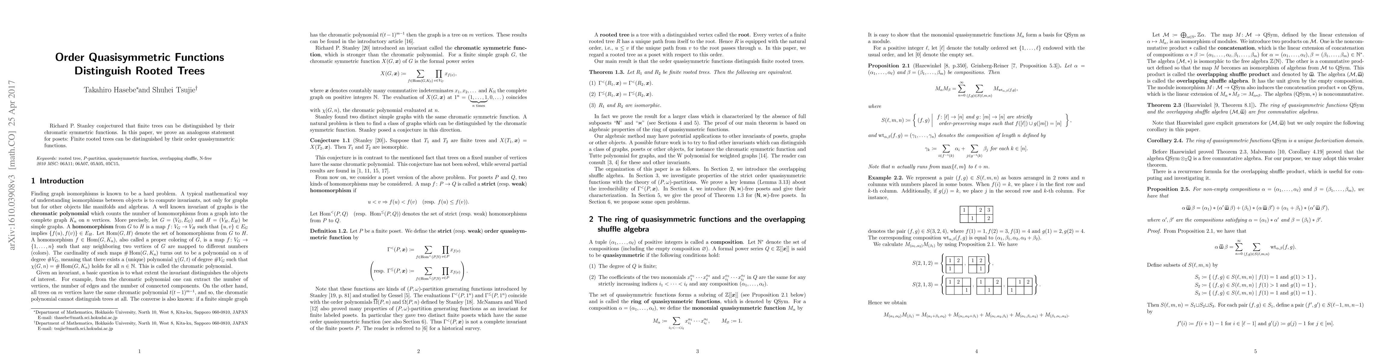 Richard P. Stanley conjectured that finite trees can be distinguished by their chromatic symmetric functions. In this paper, we prove an analogous statement for posets: Finite rooted trees can be distinguished by their order quasisymmetric functions.