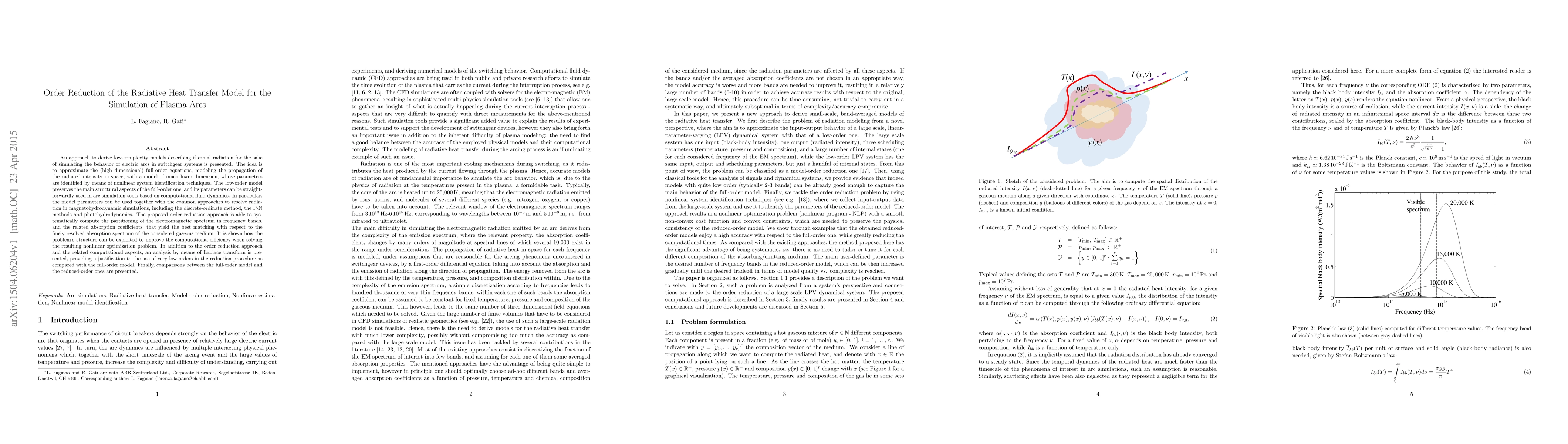 This paper presents an order reduction method for simplifying thermal radiation models in plasma arcs simulations, using nonlinear system identification to derive low-dimensional approximations. The reduced models maintain key structural features and improve computational efficiency, validated through comparisons with full-order models.