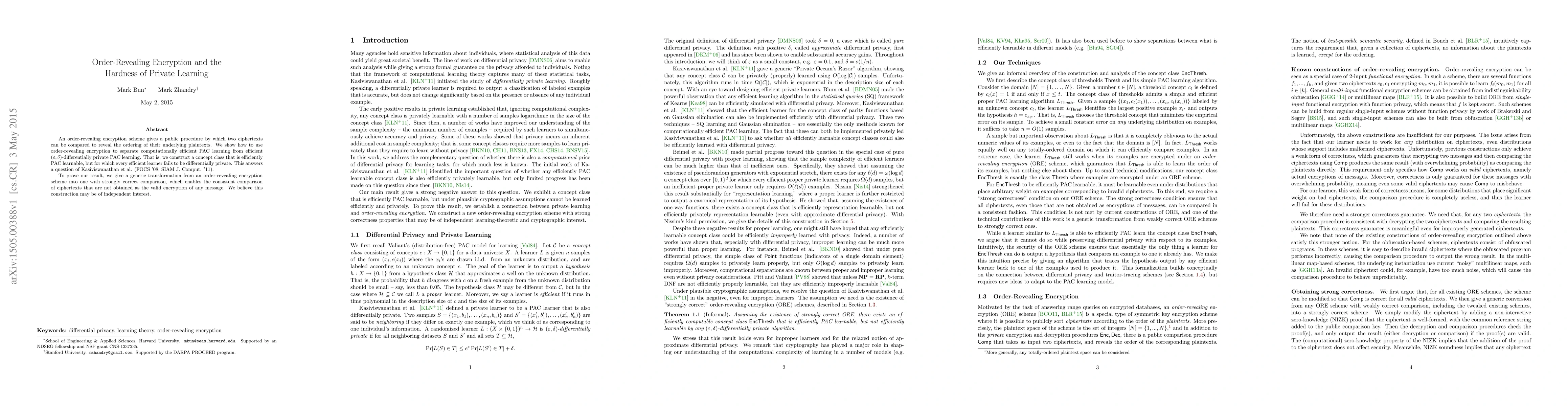 This paper explores the use of order-revealing encryption to distinguish between computationally efficient PAC learning and differentially private PAC learning. It constructs a concept class that is efficiently learnable but cannot be learned privately, answering a question posed by Kasiviswanathan et al. The authors also propose a transformation that enhances the comparison of ciphertexts, which may have broader applications.