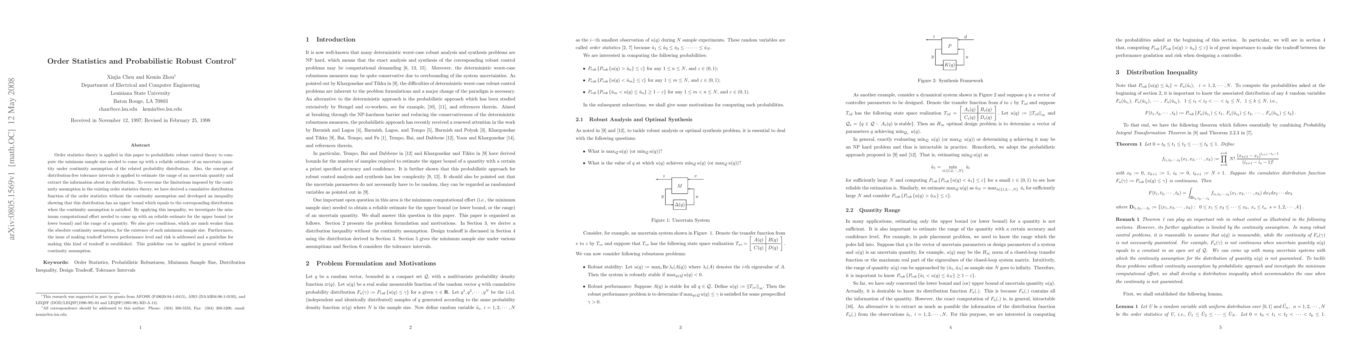 Order statistics theory is applied in this paper to probabilistic robust control theory to compute the minimum sample size needed to come up with a reliable estimate of an uncertain quantity under continuity assumption of the related probability distribution. Also, the concept of distribution-free tolerance intervals is applied to estimate the range of an uncertain quantity and extract the information about its distribution. To overcome the limitations imposed by the continuity assumption in the existing order statistics theory, we have derived a cumulative distribution function of the order statistics without the continuity assumption and developed an inequality showing that this distribution has an upper bound which equals to the corresponding distribution when the continuity assumption is satisfied. By applying this inequality, we investigate the minimum computational effort needed to come up with an reliable estimate for the upper bound (or lower bound) and the range of a quantity. We also give conditions, which are much weaker than the absolute continuity assumption, for the existence of such minimum sample size. Furthermore, the issue of making tradeoff between performance level and risk is addressed and a guideline for making this kind of tradeoff is established. This guideline can be applied in general without continuity assumption.
