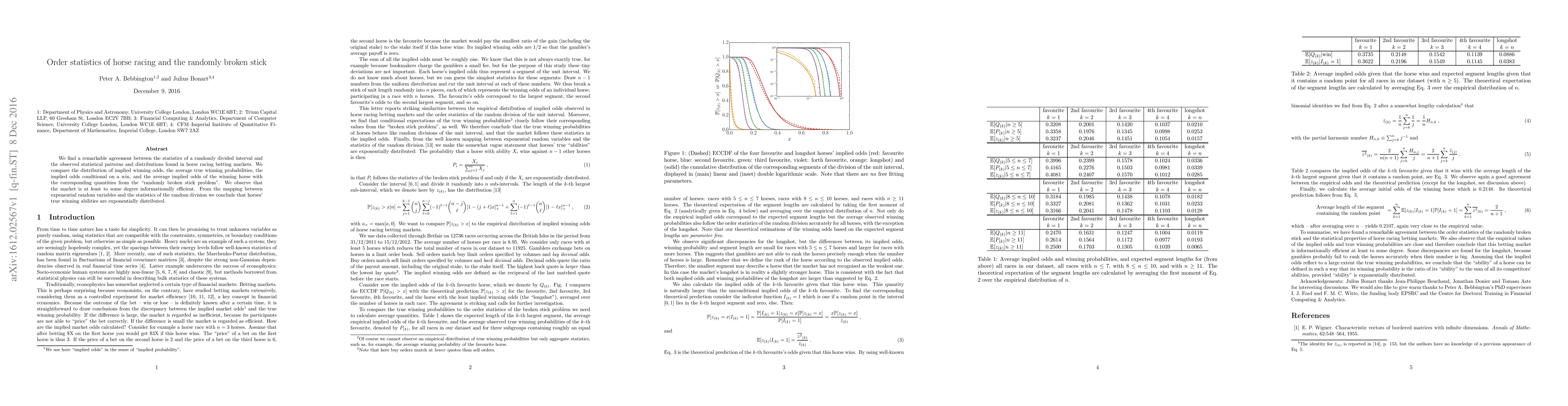 We find a remarkable agreement between the statistics of a randomly divided interval and the observed statistical patterns and distributions found in horse racing betting markets. We compare the distribution of implied winning odds, the average true winning probabilities, the implied odds conditional on a win, and the average implied odds of the winning horse with the corresponding quantities from the "randomly broken stick problem". We observe that the market is at least to some degree informationally efficient. From the mapping between exponential random variables and the statistics of the random division we conclude that horses' true winning abilities are exponentially distributed.