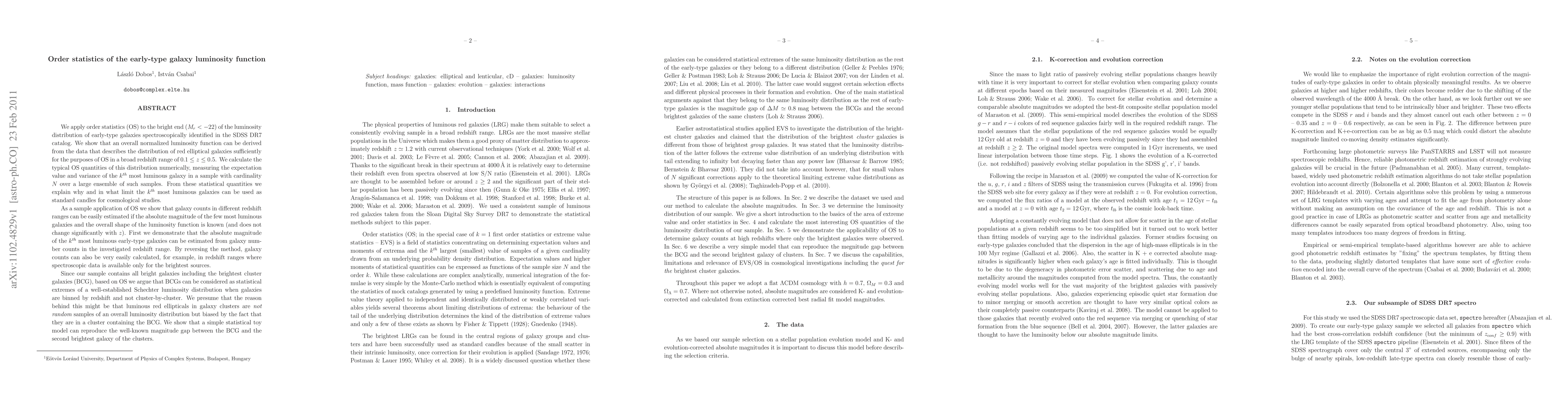 This paper uses order statistics to analyze the luminosity distribution of early-type galaxies in the SDSS DR7 catalog, finding that the brightest galaxies, including brightest cluster galaxies (BCGs), can serve as standard candles in cosmology. It argues that BCGs are statistical extremes of a luminosity distribution, not random samples, and proposes a simple model explaining the magnitude gap between BCGs and other cluster galaxies.