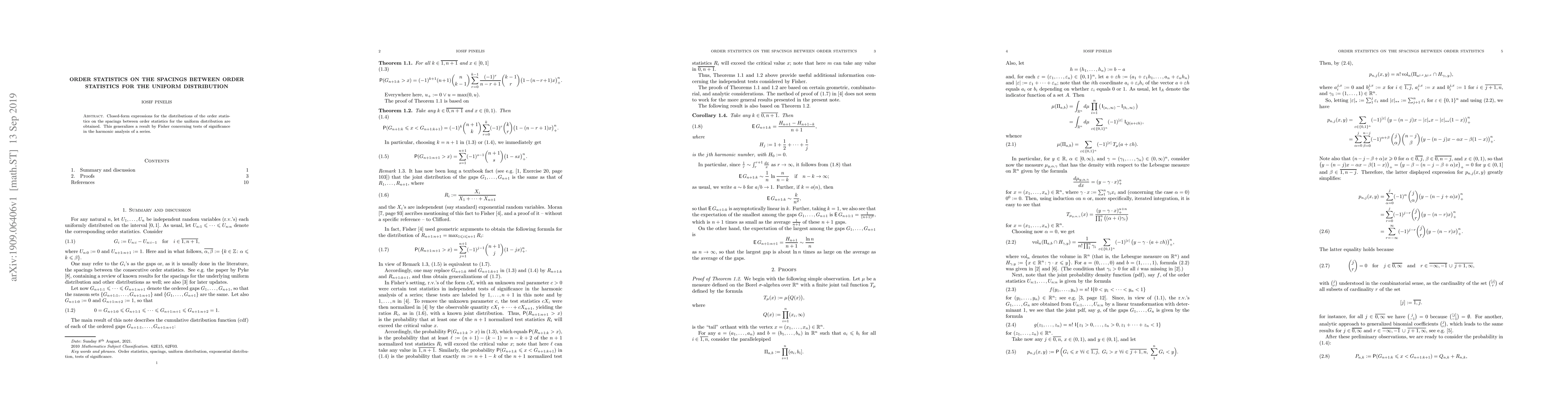 This paper presents closed-form expressions for the distributions of spacings between order statistics for the uniform distribution, expanding on Fisher's work related to statistical significance tests in harmonic analysis of series.