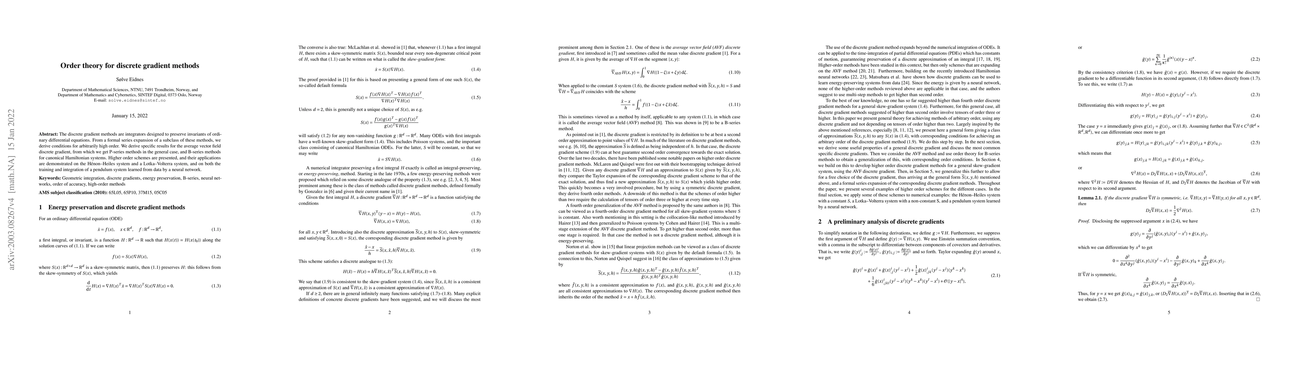 This paper develops discrete gradient methods to preserve invariants of ordinary differential equations, deriving conditions for high-order integrators. It applies these methods to the Hénon-Heiles and Lotka-Volterra systems, and demonstrates their use in neural network-based pendulum system training and integration.