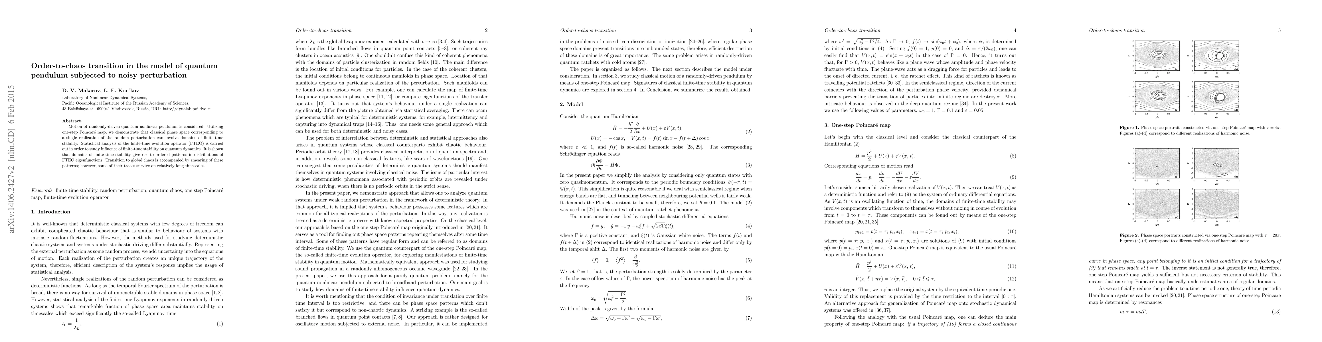 Motion of randomly-driven quantum nonlinear pendulum is considered. Utilizing one-step Poincar\'e map, we demonstrate that classical phase space corresponding to a single realization of the random perturbation involves domains of finite-time stability. Statistical analysis of the finite-time evolution operator (FTEO) is carried out in order to study influence of finite-time stability on quantum dynamics. It is shown that domains of finite-time stability give rise to ordered patterns in distributions of FTEO eigenfunctions. Transition to global chaos is accompanied by smearing of these patterns; however, some of their traces survive on relatively long timescales.