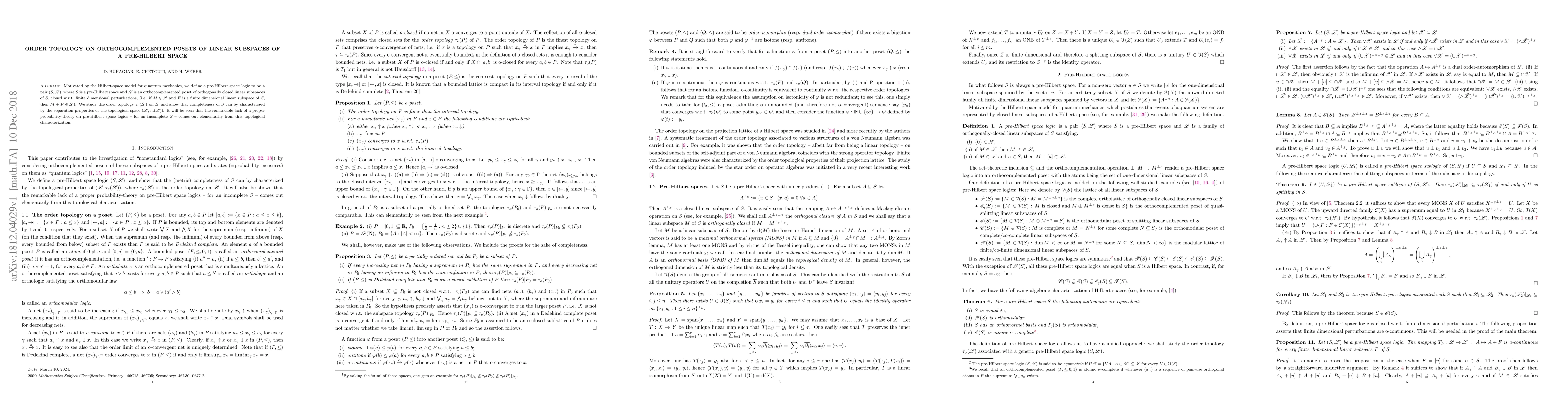 Motivated by the Hilbert-space model for quantum mechanics, we define a pre-Hilbert space logic to be a pair $(S,\el)$, where $S$ is a pre-Hilbert space and $\el$ is an orthocomplemented poset of orthogonally closed linear subspaces of $S$, closed w.r.t. finite dimensional perturbations, (i.e. if $M\in\el$ and $F$ is a finite dimensional linear subspace of $S$, then $M+F\in \el$). We study the order topology $\tau_o(\el)$ on $\el$ and show that completeness of $S$ can by characterized by the separation properties of the topological space $(\el,\tau_o(\el))$. It will be seen that the remarkable lack of a proper probability-theory on pre-Hilbert space logics -- for an incomplete $S$ -- comes out elementarily from this topological characterization.
