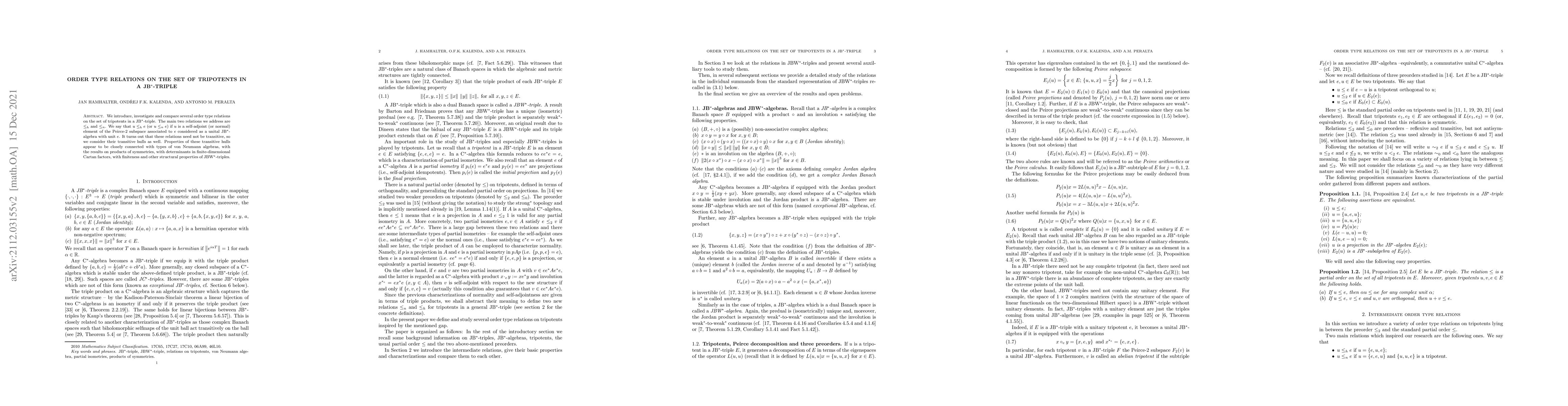 We introduce, investigate and compare several order type relations on the set of tripotents in a JB$^*$-triple. The main two relations we address are $\le_h$ and $\le_n$. We say that $u\le_h e$ (or $u\le_n e$) if $u$ is a self-adjoint (or normal) element of the Peirce-2 subspace associated to $e$ considered as a unital JB$^*$-algebra with unit $e$. It turns out that these relations need not be transitive, so we consider their transitive hulls as well. Properties of these transitive hulls appear to be closely connected with types of von Neumann algebras, with the results on products of symmetries, with determinants in finite-dimensional Cartan factors, with finiteness and other structural properties of JBW$^*$-triples.