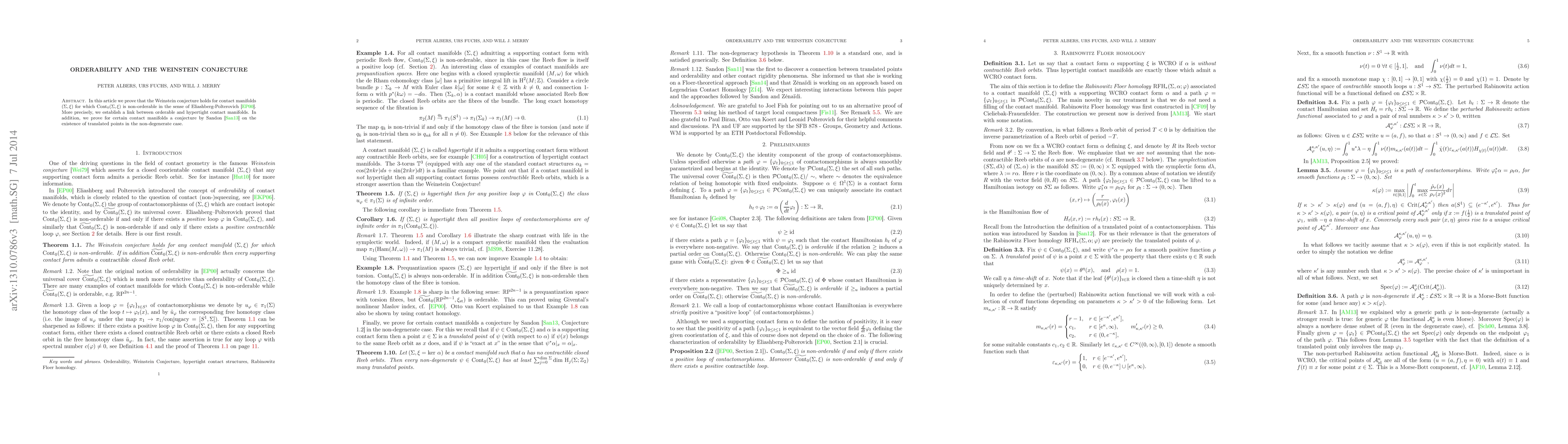 This paper proves the Weinstein conjecture for contact manifolds where the zero-contact structure is non-orderable, linking orderable and hypertight contact manifolds. It also verifies a conjecture by Sandon regarding translated points in non-degenerate contact manifolds.