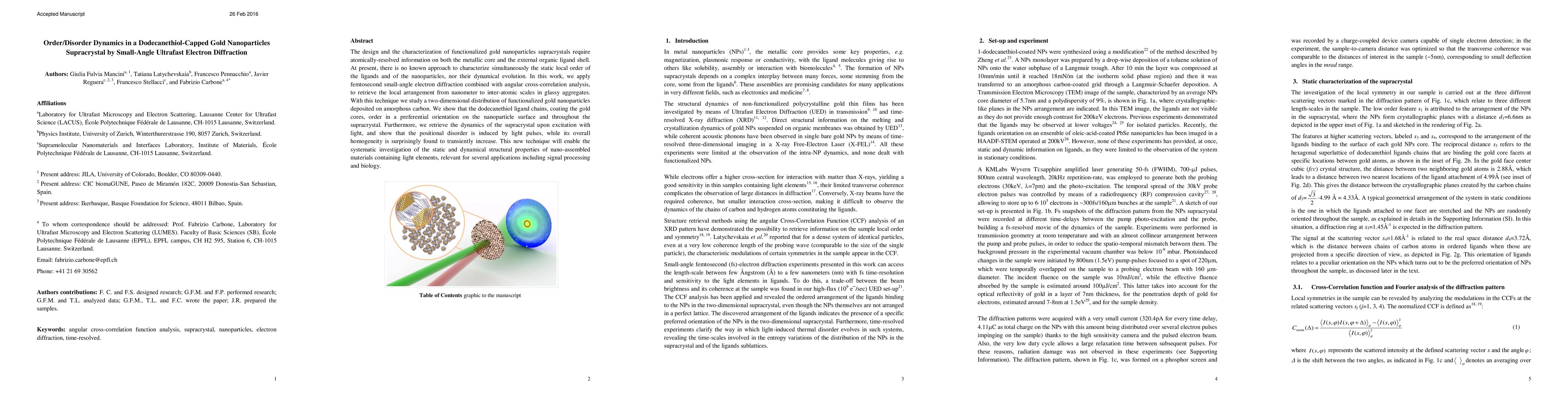 In metal nanoparticles (NPs) supracrystals, the metallic core provides some key properties, e.g. magnetization, plasmonic response or conductivity, with the ligand molecules giving rise to others like solubility, assembly or interaction with biomolecules. The formation of these supracrystals depends on a complex interplay between many forces, some stemming from the core, some from the ligands. At present, there is no known approach to characterize the local order of ligand molecules or their dynamics with atomic spatial resolution. Here, we develop a methodology based on small-angle ultrafast electron diffraction combined with angular cross-correlation analysis to characterize a two-dimensional supracrystal of dodecanethiol-coated gold NPs. We retrieve the static arrangement of the ligands, showing that at equilibrium they order in a preferential orientation on the NPs surface and throughout the two-dimensional supracrystal. Upon light excitation, positional disorder is induced in the supracrystal, while its overall homogeneity is surprisingly found to transiently increase. This suggests that transient annealing of the supracrystal takes place within few picoseconds (ps). This methodology will enable the systematic investigation of the dynamical structural properties of nano-assembled materials containing light elements, relevant for biological applications.