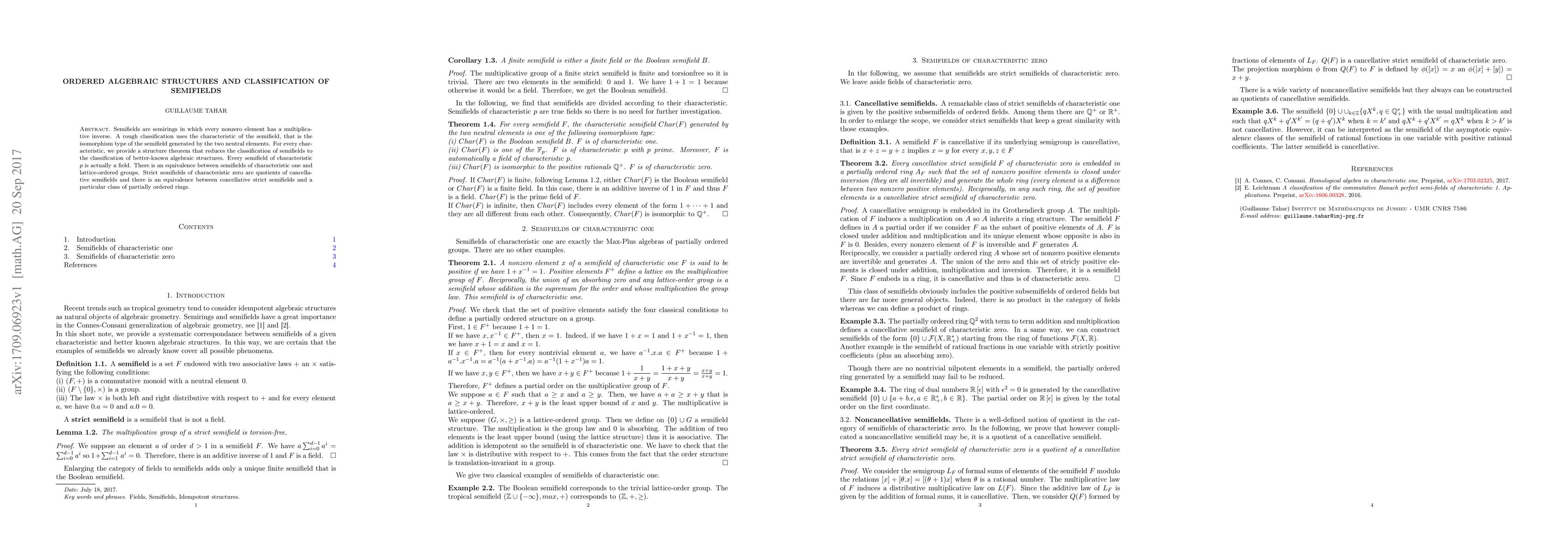 This paper classifies semifields by their characteristic, showing that semifields of characteristic $p$ are fields, those of characteristic one relate to lattice-ordered groups, and strict semifields of characteristic zero relate to cancellative semifields and partially ordered rings.
