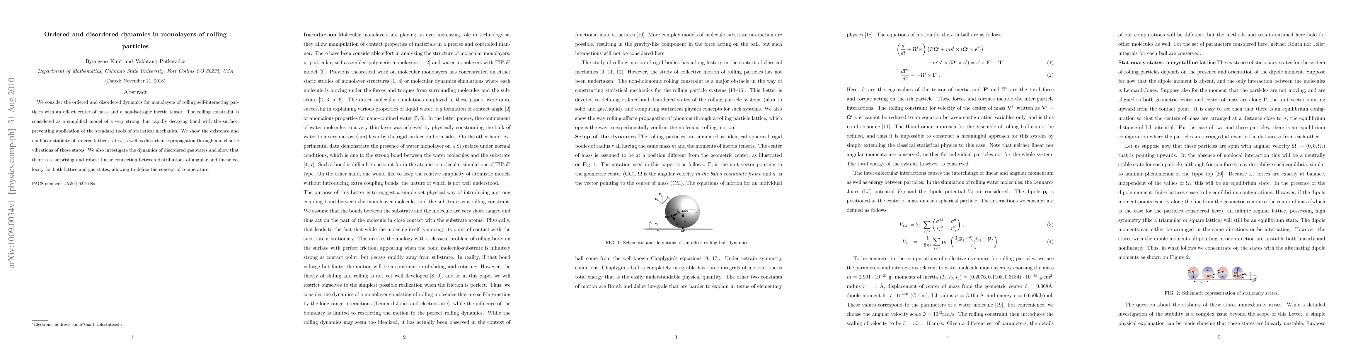 We consider the ordered and disordered dynamics for monolayers of rolling self-interacting particles with an offset center of mass and a non-isotropic inertia tensor. The rolling constraint is considered as a simplified model of a very strong, but rapidly decaying bond with the surface, preventing application of the standard tools of statistical mechanics. We show the existence and nonlinear stability of ordered lattice states, as well as disturbance propagation through and chaotic vibrations of these states. We also investigate the dynamics of disordered gas states and show that there is a surprising and robust linear connection between distributions of angular and linear velocity for both lattice and gas states, allowing to define the concept of temperature.
