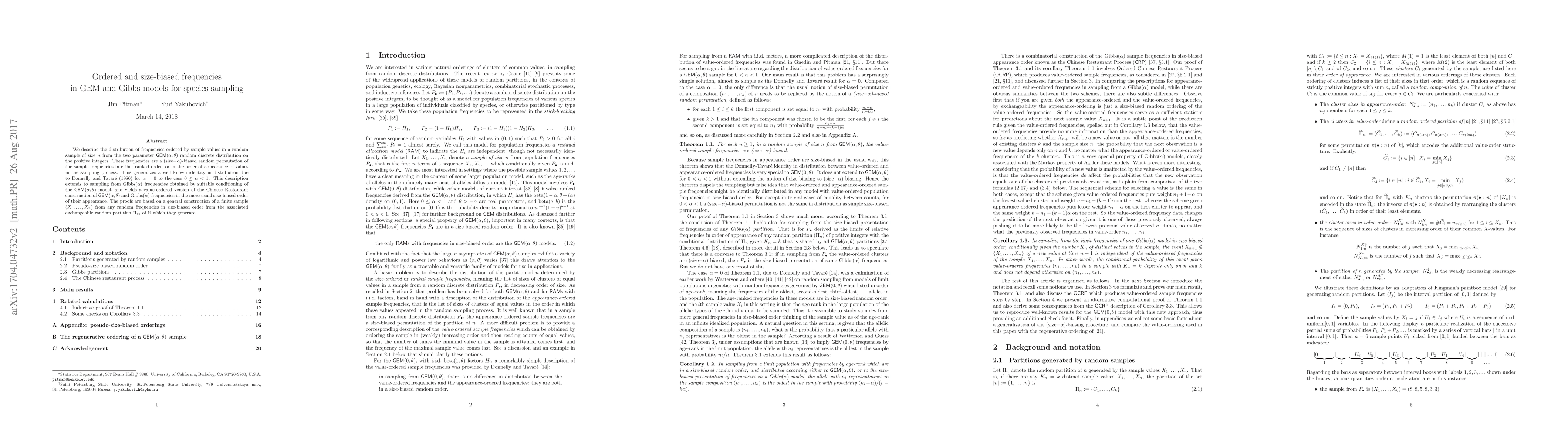 We describe the distribution of frequencies ordered by sample values in a random sample of size $n$ from the two parameter GEM$(\alpha,\theta)$ random discrete distribution on the positive integers. These frequencies are a $($size$-\alpha)$-biased random permutation of the sample frequencies in either ranked order, or in the order of appearance of values in the sampling process. This generalizes a well known identity in distribution due to Donnelly and Tavar\'e (1986) for $\alpha = 0$ to the case $0 \le \alpha < 1$. This description extends to sampling from Gibbs$(\alpha)$ frequencies obtained by suitable conditioning of the GEM$(\alpha,\theta)$ model, and yields a value-ordered version of the Chinese Restaurant construction of GEM$(\alpha,\theta)$ and Gibbs$(\alpha)$ frequencies in the more usual size-biased order of their appearance. The proofs are based on a general construction of a finite sample $(X_1,\dots,X_n)$ from any random frequencies in size-biased order from the associated exchangeable random partition $\Pi_\infty$ of $\mathbb{N}$ which they generate.