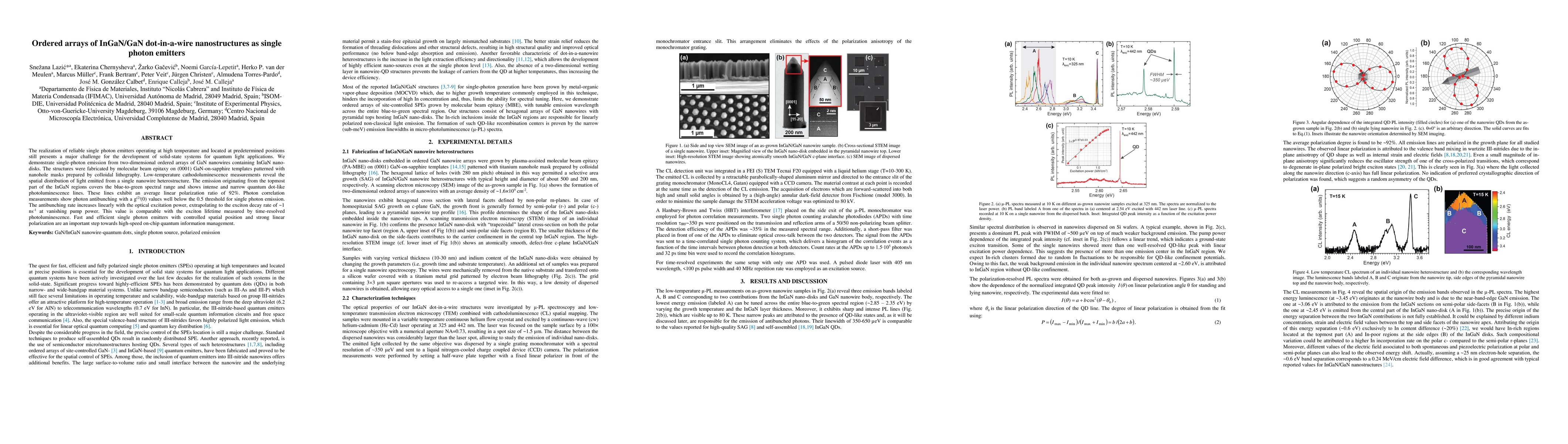 This paper demonstrates the fabrication of ordered arrays of InGaN/GaN dot-in-a-wire nanostructures that emit single photons with high efficiency and strong linear polarization. The structures exhibit photon antibunching, confirming their potential for high-speed on-chip quantum information management.