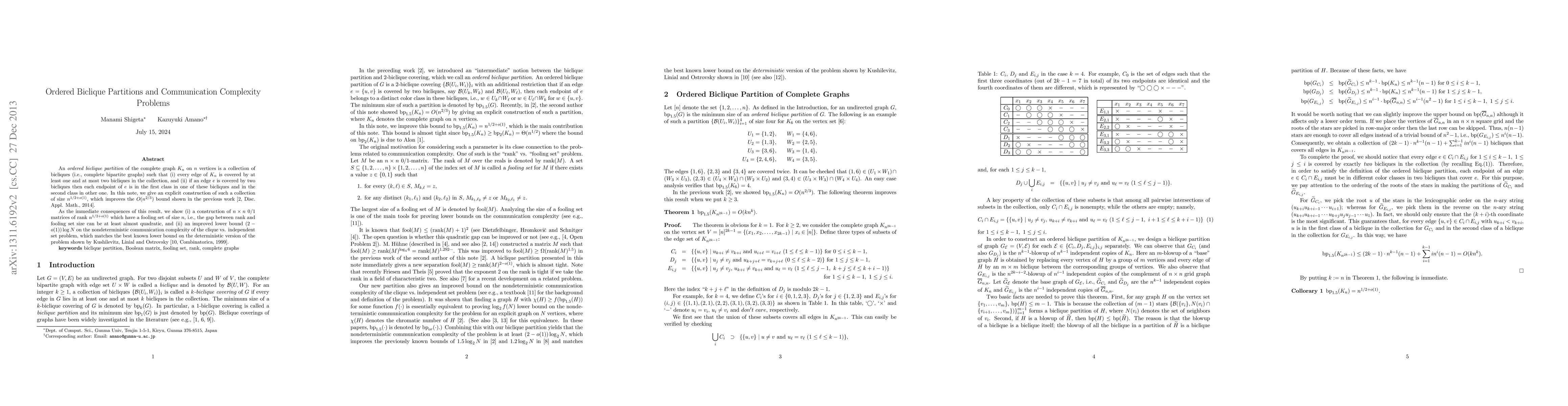 An ordered biclique partition of the complete graph $K_n$ on $n$ vertices is a collection of bicliques (i.e., complete bipartite graphs) such that (i) every edge of $K_n$ is covered by at least one and at most two bicliques in the collection, and (ii) if an edge $e$ is covered by two bicliques then each endpoint of $e$ is in the first class in one of these bicliques and in the second class in other one. In this note, we give an explicit construction of such a collection of size $n^{1/2+o(1)}$, which improves the $O(n^{2/3})$ bound shown in the previous work [Disc. Appl. Math., 2014]. As the immediate consequences of this result, we show (i) a construction of $n \times n$ 0/1 matrices of rank $n^{1/2+o(1)}$ which have a fooling set of size $n$, i.e., the gap between rank and fooling set size can be at least almost quadratic, and (ii) an improved lower bound $(2-o(1)) \log N$ on the nondeterministic communication complexity of the clique vs. independent set problem, which matches the best known lower bound on the deterministic version of the problem shown by Kushilevitz, Linial and Ostrovsky [Combinatorica, 1999].
