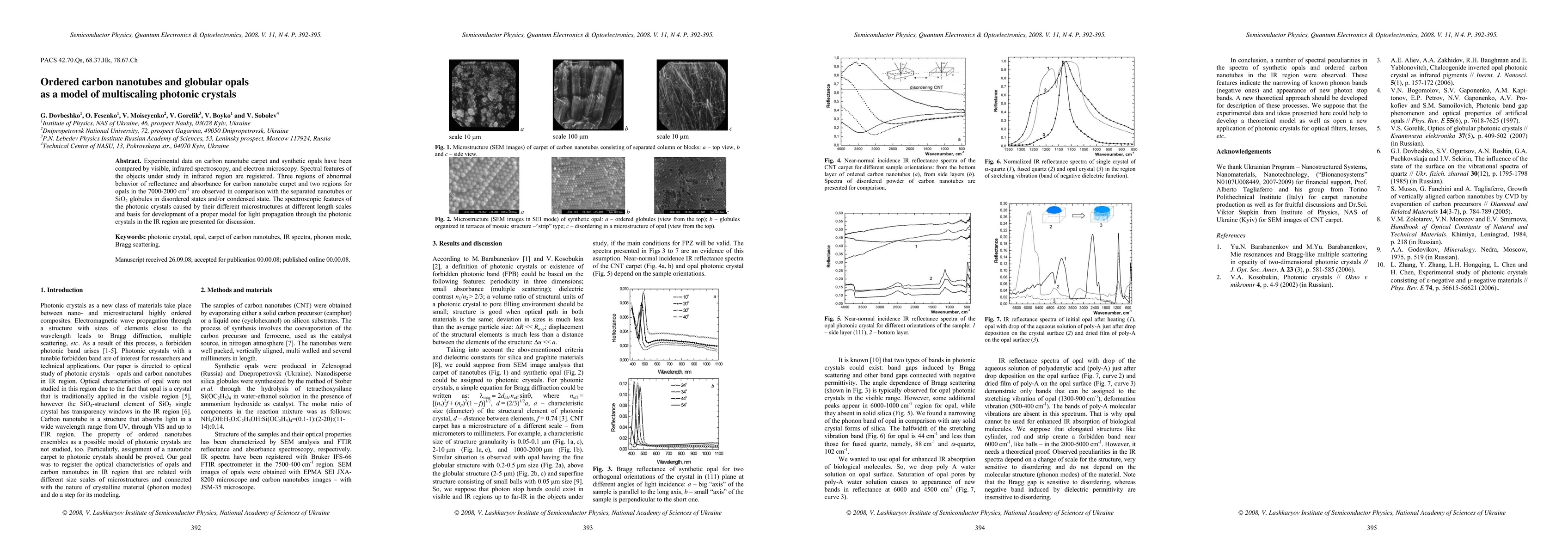 This paper explores the optical properties of ordered carbon nanotube carpets and synthetic opals, identifying distinct photonic crystal behaviors through spectroscopy and microscopy. The study reveals multiple abnormal reflectance and absorbance regions in the infrared spectrum, highlighting the impact of microstructure on light propagation and suggesting a basis for developing multiscale models for photonic crystals.