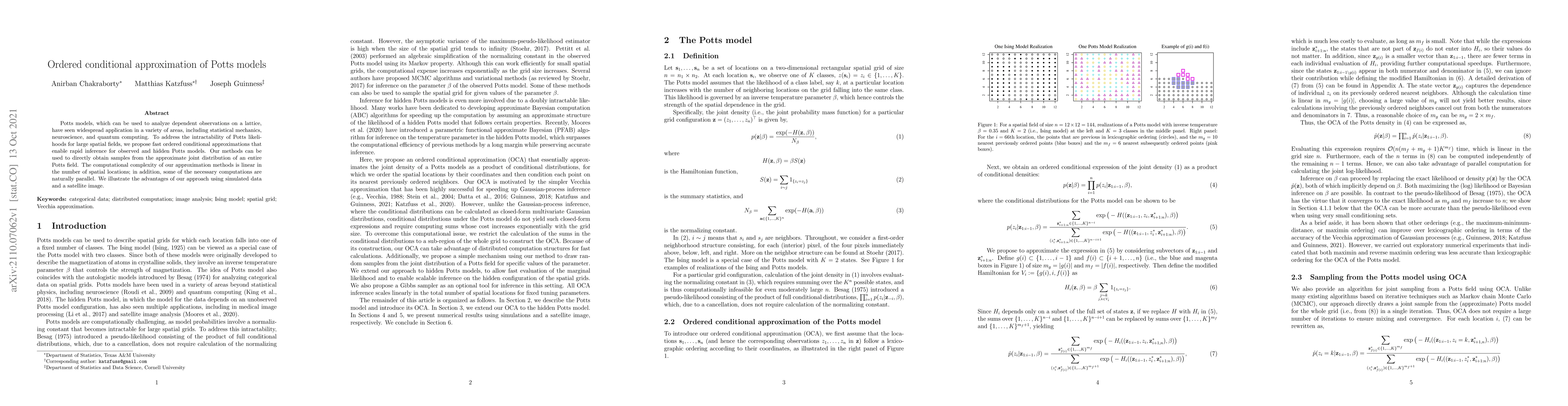 This paper proposes fast ordered conditional approximations to tackle the intractability of Potts models' likelihoods for large spatial fields, enabling rapid inference and sampling. The proposed methods have linear computational complexity and are parallelizable, demonstrated through simulated data and satellite imagery.