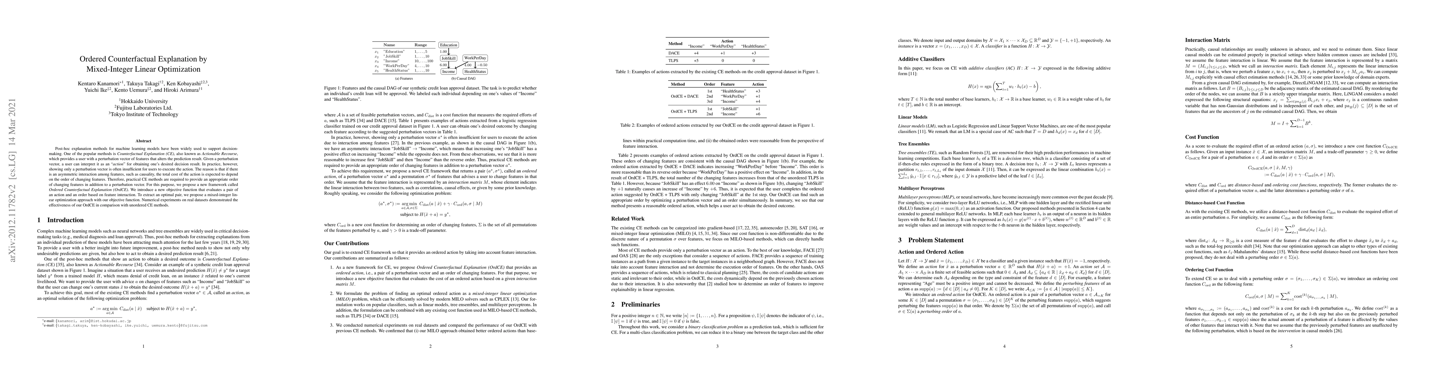 Post-hoc explanation methods for machine learning models have been widely used to support decision-making. One of the popular methods is Counterfactual Explanation (CE), also known as Actionable Recourse, which provides a user with a perturbation vector of features that alters the prediction result. Given a perturbation vector, a user can interpret it as an "action" for obtaining one's desired decision result. In practice, however, showing only a perturbation vector is often insufficient for users to execute the action. The reason is that if there is an asymmetric interaction among features, such as causality, the total cost of the action is expected to depend on the order of changing features. Therefore, practical CE methods are required to provide an appropriate order of changing features in addition to a perturbation vector. For this purpose, we propose a new framework called Ordered Counterfactual Explanation (OrdCE). We introduce a new objective function that evaluates a pair of an action and an order based on feature interaction. To extract an optimal pair, we propose a mixed-integer linear optimization approach with our objective function. Numerical experiments on real datasets demonstrated the effectiveness of our OrdCE in comparison with unordered CE methods.