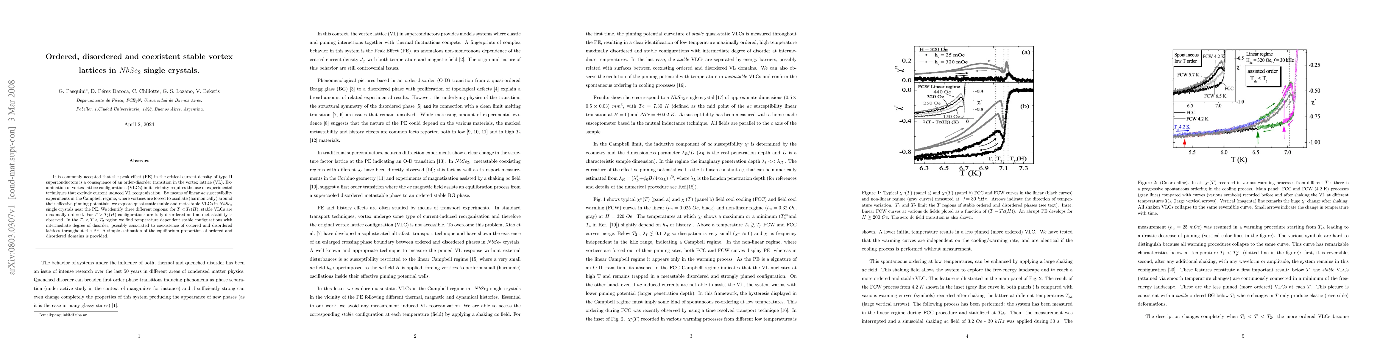 This study investigates vortex lattice configurations in NbSe₂ single crystals using linear ac susceptibility experiments, revealing three distinct regions: maximally ordered lattices below T₁, fully disordered lattices above T₂, and intermediate disorder with potential coexistence of ordered and disordered domains between T₁ and T₂ near the peak effect.