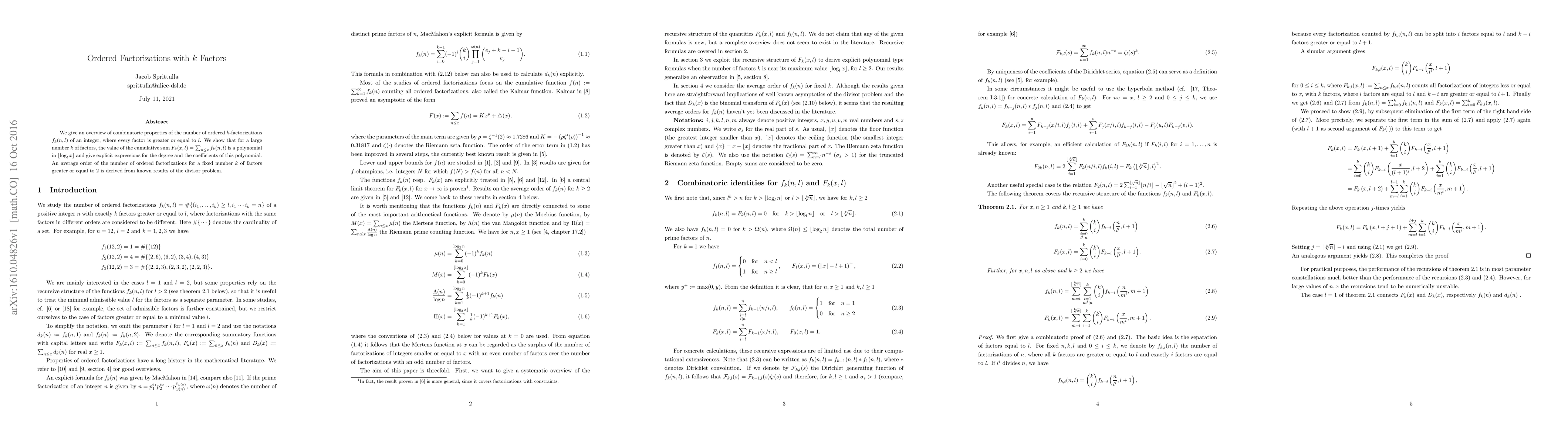 The paper explores combinatoric properties of ordered k-factorizations of an integer where each factor is greater than or equal to a given l. It derives explicit expressions for the degree and coefficients of a polynomial representing the cumulative sum of these factorizations.