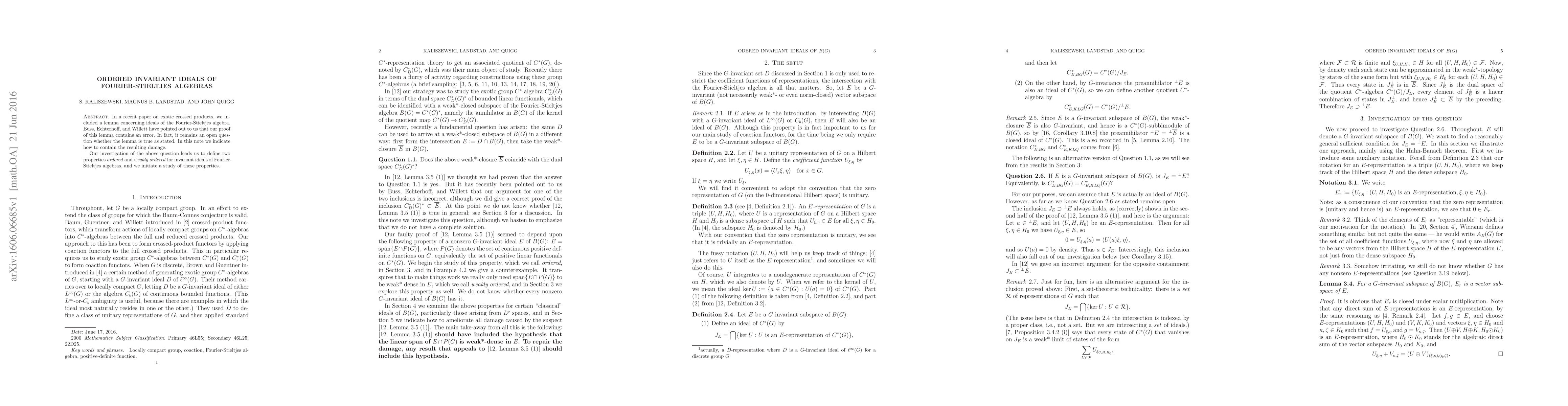 In a recent paper on exotic crossed products, we included a lemma concerning ideals of the Fourier-Stieltjes algebra. Buss, Echterhoff, and Willett have pointed out to us that our proof of this lemma contains an error. In fact, it remains an open question whether the lemma is true as stated. In this note we indicate how to contain the resulting damage. Our investigation of the above question leads us to define two properties \emph{ordered} and \emph{weakly ordered} for invariant ideals of Fourier-Stieltjes algebras, and we initiate a study of these properties.