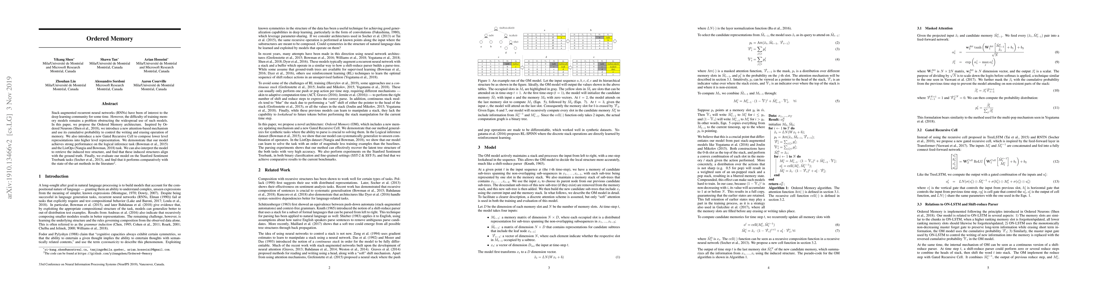 Researchers propose a new memory model called Ordered Memory that uses attention-based mechanisms to improve training and performance on tasks like logical inference and sentiment analysis. The model outperforms state-of-the-art methods in these areas, offering a promising solution for complex memory tasks.