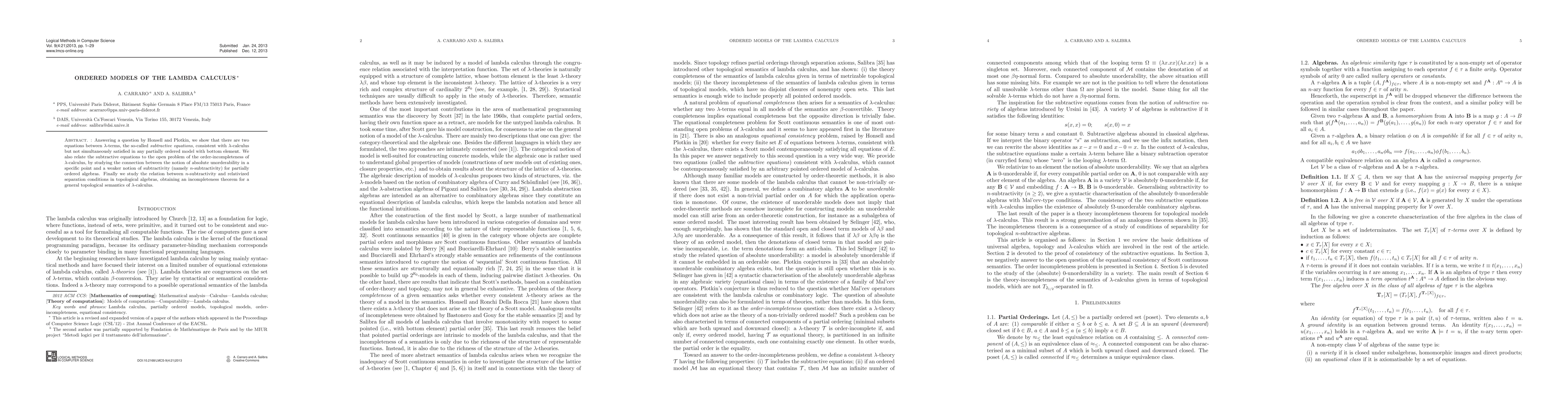 Answering a question by Honsell and Plotkin, we show that there are two equations between lambda terms, the so-called subtractive equations, consistent with lambda calculus but not simultaneously satisfied in any partially ordered model with bottom element. We also relate the subtractive equations to the open problem of the order-incompleteness of lambda calculus, by studying the connection between the notion of absolute unorderability in a specific point and a weaker notion of subtractivity (namely n-subtractivity) for partially ordered algebras. Finally we study the relation between n-subtractivity and relativized separation conditions in topological algebras, obtaining an incompleteness theorem for a general topological semantics of lambda calculus.