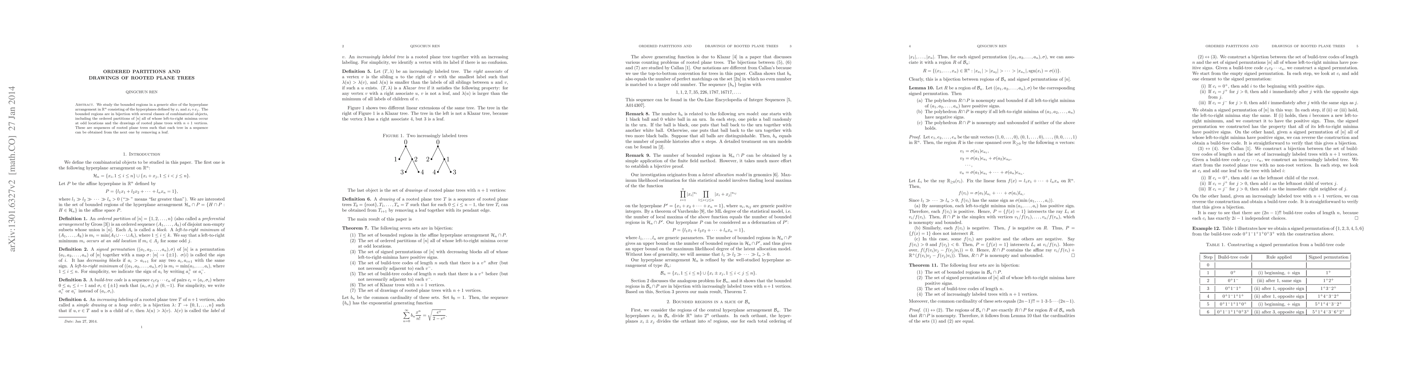 This paper investigates the bounded regions in the hyperplane arrangement defined by certain linear equations, establishing a bijection between these regions and ordered partitions and specific drawings of rooted plane trees. These combinatorial objects are characterized by unique structural properties.