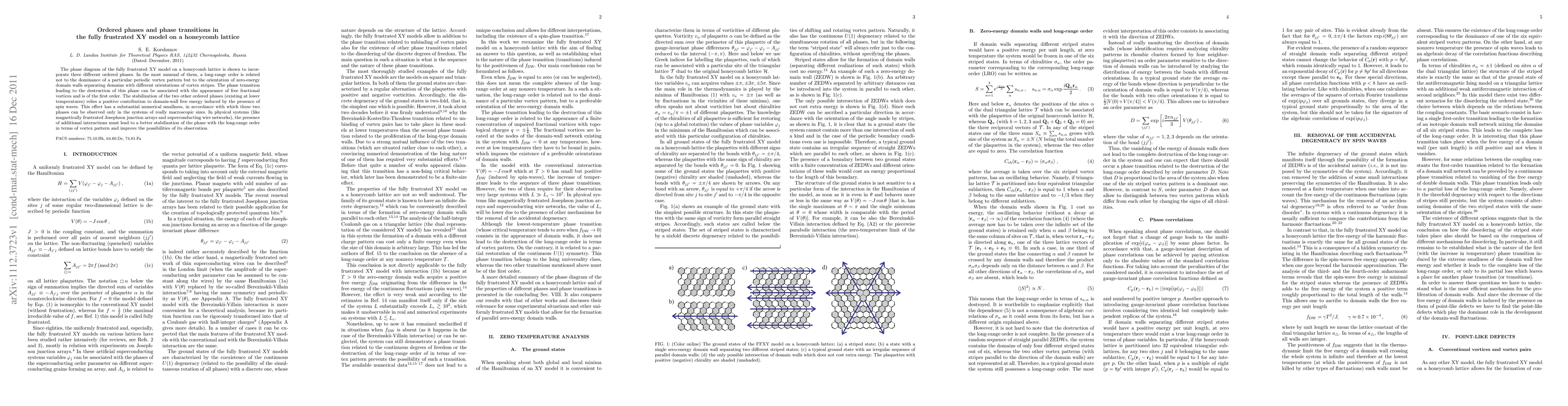 The phase diagram of the fully frustrated XY model on a honeycomb lattice is shown to incorporate three different ordered phases. In the most unusual of them, a long-range order is related not to the dominance of a particular periodic vortex pattern but to the orientation of zero-energy domain walls separating domains with different orientations of vortex stripes. The phase transition leading to the destruction of this phase can be associated with the appearance of free fractional vortices and is of the first order. The stabilization of the two other ordered phases (existing at lower temperatures) relies a positive contribution to domain-wall free energy induced by the presence of spin waves. This effect has a substantial numerical smallness, in accordance with which these two phases can be observed only in the systems of really macroscopic sizes. In physical systems (like magnetically frustrated Josephson junction arrays and superconducting wire networks), the presence of additional interactions must lead to a better stabilization of the phase with the long-range order in terms of vortex pattern and improve the possibilities of its observation.