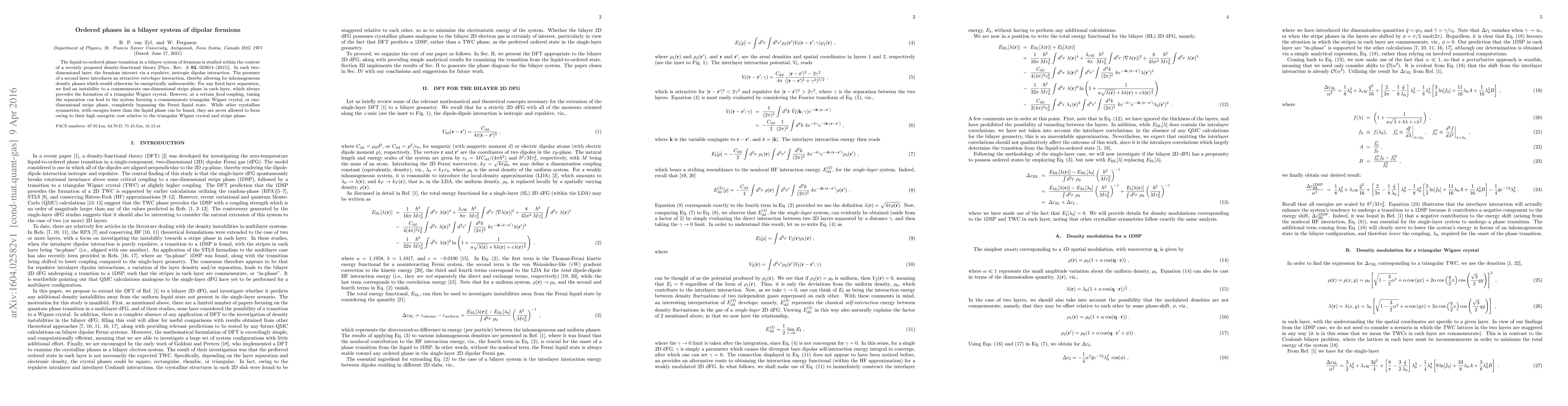 The liquid-to-ordered phase transition in a bilayer system of fermions is studied within the context of a recently proposed density-functional theory [Phys. Rev. A {\bf 92}, 023614 (2015)]. In each two-dimensional layer, the fermions interact via a repulsive, isotropic dipolar interaction. The presence of a second layer introduces an attractive {\em interlayer} interaction, thereby allowing for inhomogeneous density phases which would otherwise be energetically unfavourable. For any fixed layer separation, we find an instability to a commensurate one-dimensional stripe phase in each layer, which always precedes the formation of a triangular Wigner crystal. However, at a certain {\em fixed} coupling, tuning the separation can lead to the system favoring a commensurate triangular Wigner crystal, or one-dimensional stripe phase, completely bypassing the Fermi liquid state. While other crystalline symmetries, with energies lower than the liquid phase can be found, they are never allowed to form owing to their high energetic cost relative to the triangular Wigner crystal and stripe phase.