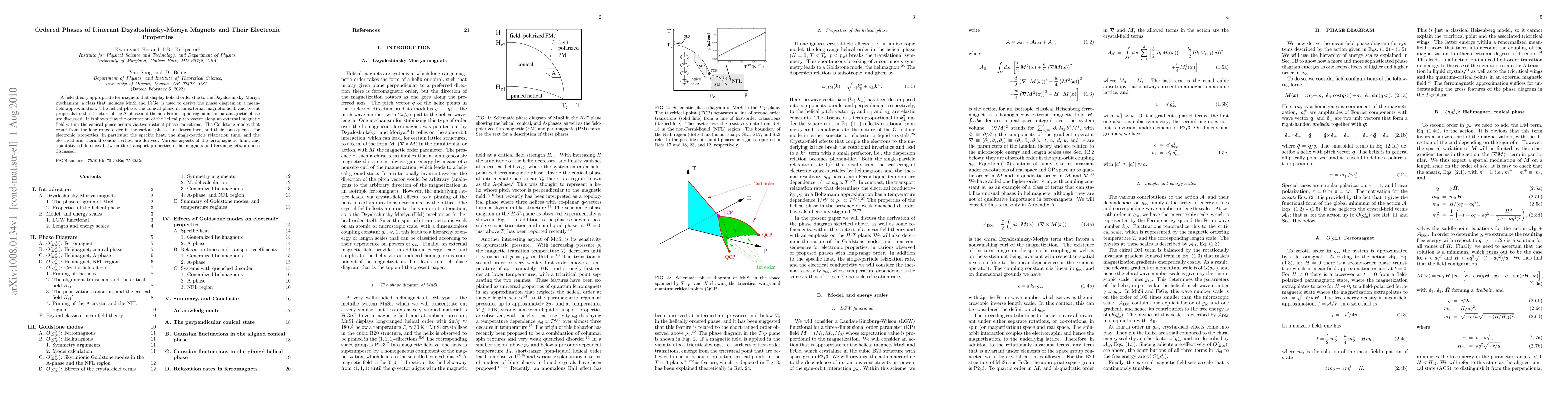 A field theory appropriate for magnets that display helical order due to the Dzyaloshinsky-Moriya mechanism, a class that includes MnSi and FeGe, is used to derive the phase diagram in a mean-field approximation. The helical phase, the conical phase in an external magnetic field, and recent proposals for the structure of the A-phase and the non-Fermi-liquid region in the paramagnetic phase are discussed. It is shown that the orientation of the helical pitch vector along an external magnetic field within the conical phase occurs via two distinct phase transitions. The Goldstone modes that result from the long-range order in the various phases are determined, and their consequences for electronic properties, in particular the specific heat, the single-particle relaxation time, and the electrical and thermal conductivities, are derived. Various aspects of the ferromagnetic limit, and qualitative differences between the transport properties of helimagnets and ferromagnets, are also discussed.