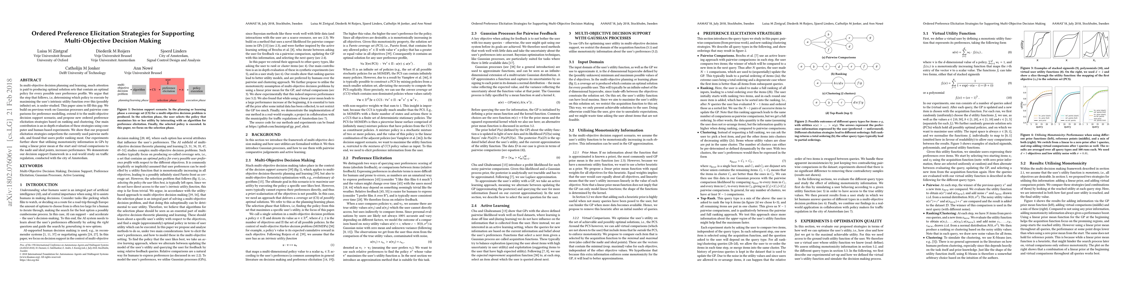 In multi-objective decision planning and learning, much attention is paid to producing optimal solution sets that contain an optimal policy for every possible user preference profile. We argue that the step that follows, i.e, determining which policy to execute by maximising the user's intrinsic utility function over this (possibly infinite) set, is under-studied. This paper aims to fill this gap. We build on previous work on Gaussian processes and pairwise comparisons for preference modelling, extend it to the multi-objective decision support scenario, and propose new ordered preference elicitation strategies based on ranking and clustering. Our main contribution is an in-depth evaluation of these strategies using computer and human-based experiments. We show that our proposed elicitation strategies outperform the currently used pairwise methods, and found that users prefer ranking most. Our experiments further show that utilising monotonicity information in GPs by using a linear prior mean at the start and virtual comparisons to the nadir and ideal points, increases performance. We demonstrate our decision support framework in a real-world study on traffic regulation, conducted with the city of Amsterdam.