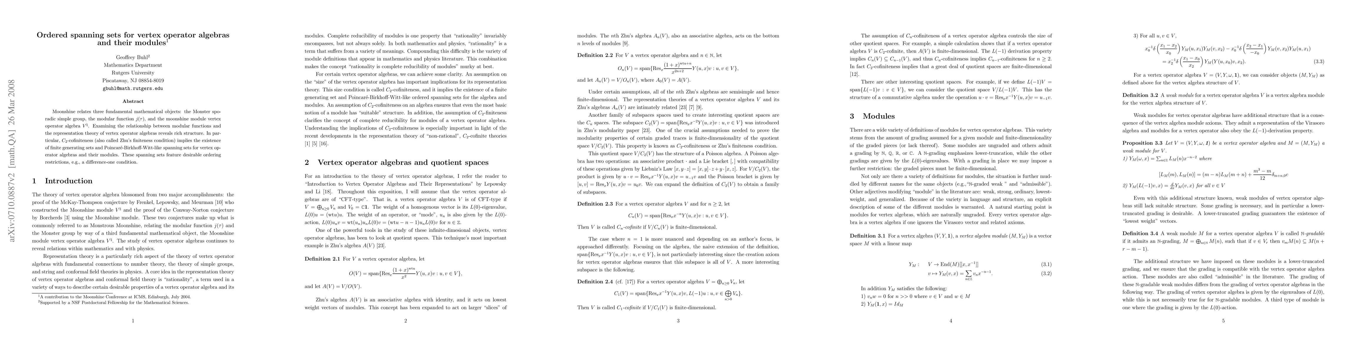 Moonshine relates three fundamental mathematical objects: the Monster sporadic simple group, the modular function j, and the moonshine module vertex operator algebra. Examining the relationship between modular functions and the representation theory of vertex operator algebras reveals rich structure. In particular, C2-cofiniteness (also called Zhu's finiteness condition) implies the existence of finite generating sets and Poincare-Birkhoff-Witt-like spanning sets for vertex operator algebras and their modules. These spanning sets feature desirable ordering restrictions, e.g., a difference-one condition.