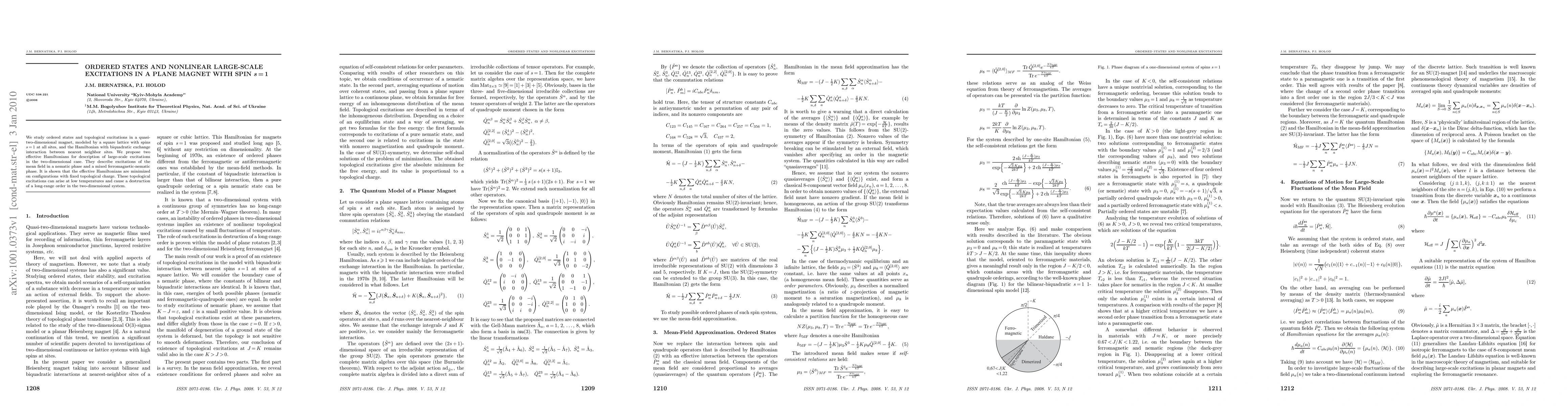 We study ordered states and topological excitations in a quasi-two-dimensional magnet, modeled by a square lattice with spins $s {=} 1$ at all sites, and the Hamiltonian with biquadratic exchange interaction between nearest neighbor sites. We propose two effective Hamiltonians for description of large-scale excitations in the two-dimensional case. They describe excitations of the mean field in a nematic phase and a mixed ferromagnetic-nematic phase. It is shown that the effective Hamiltonians are minimized on configurations with fixed topological charge. These topological excitations can arise at low temperatures and cause a destruction of a long-range order in the two-dimensional system.