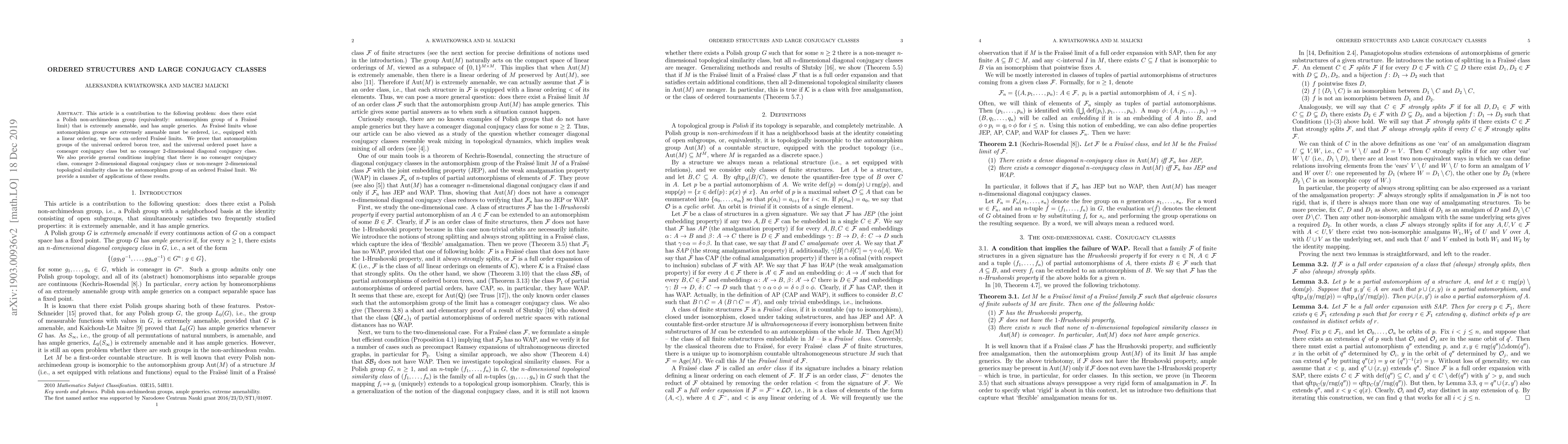 This paper investigates whether there exists an extremely amenable Polish non-archimedean group with ample generics, focusing on ordered Fraisse limits. The authors prove that certain ordered structures, like the universal ordered boron tree and poset, have comeager conjugacy classes but lack comeager 2-dimensional diagonal conjugacy classes.