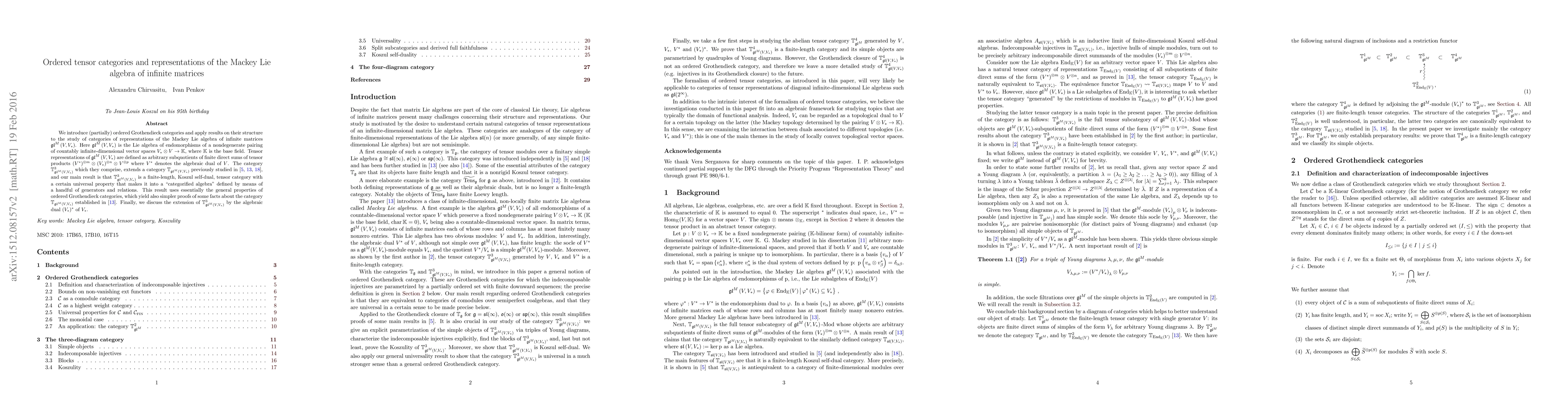 We introduce (partially) ordered Grothendieck categories and apply results on their structure to the study of categories of representations of the Mackey Lie algebra of infinite matrices $\mathfrak{gl}^M\left(V,V_*\right)$. Here $\mathfrak{gl}^M\left(V,V_*\right)$ is the Lie algebra of endomorphisms of a nondegenerate pairing of countably infinite-dimensional vector spaces $V_*\otimes V\to\mathbb{K}$, where $\mathbb{K}$ is the base field. Tensor representations of $\mathfrak{gl}^M\left(V,V_*\right)$ are defined as arbitrary subquotients of finite direct sums of tensor products $(V^*)^{\otimes m}\otimes (V_*)^{\otimes n}\otimes V^{\otimes p}$ where $V^*$ denotes the algebraic dual of $V$. The category $\mathbb{T}^3_{\mathfrak{gl}^M\left(V,V_*\right)}$ which they comprise, extends a category $\mathbb{T}_{\mathfrak{gl}^M\left(V,V_*\right)}$ previously studied in [4, 12,17], and our main result is that $\mathbb{T}^3_{\mathfrak{gl}^M\left(V,V_*\right)}$ is a finite-length, Koszul self-dual, tensor category with a certain universal property that makes it into a "categorified algebra" defined by means of a handful of generators and relations. This result uses essentially the general properties of ordered Grothendieck categories, which yield also simpler proofs of some facts about the category $\mathbb{T}_{\mathfrak{gl}^M\left(V,V_*\right)}$ established in [12]. Finally, we discuss the extension of $\mathbb{T}^3_{\mathfrak{gl}^M\left(V,V_*\right)}$ by the algebraic dual $(V_*)^*$ of $V_*$.
