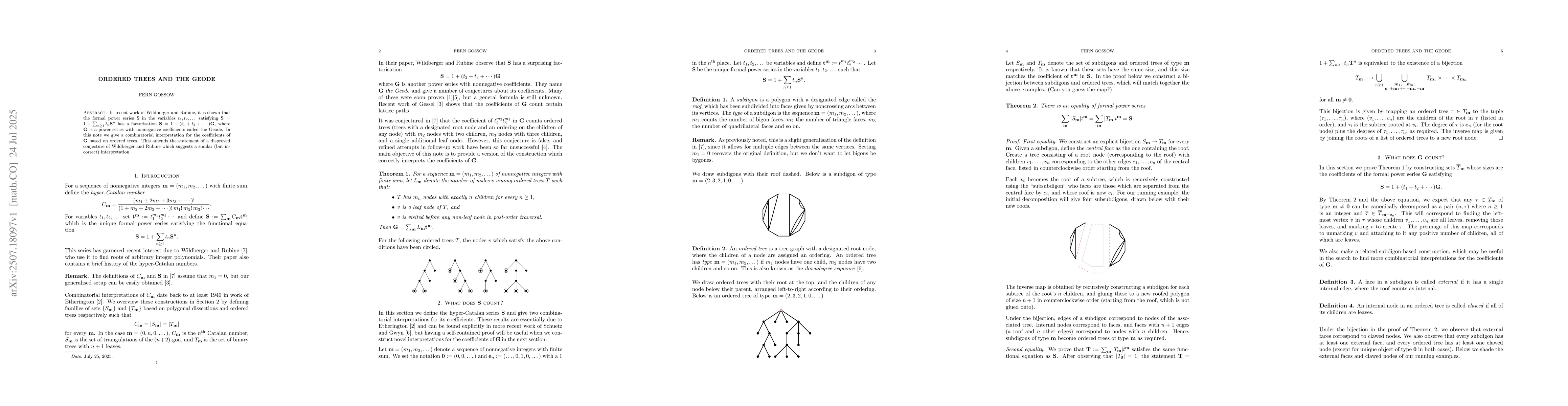 In recent work of Wildberger and Rubine, it is shown that the formal power series $\mathbf{S}$ in the variables $t_1,t_2,\dots$ satisfying $\mathbf{S}=1+\sum_{n\geq 1} t_n\mathbf{S}^n$ has a factorisation $\mathbf{S}=1+(t_1+t_2+\cdots)\mathbf{G}$, where $\mathbf{G}$ is a power series with nonnegative coefficients called the Geode. In this note we give a combinatorial interpretation for the coefficients of $\mathbf{G}$ based on ordered trees. This amends the statement of a disproved conjecture of Wildberger and Rubine which suggests a similar (but incorrect) interpretation.