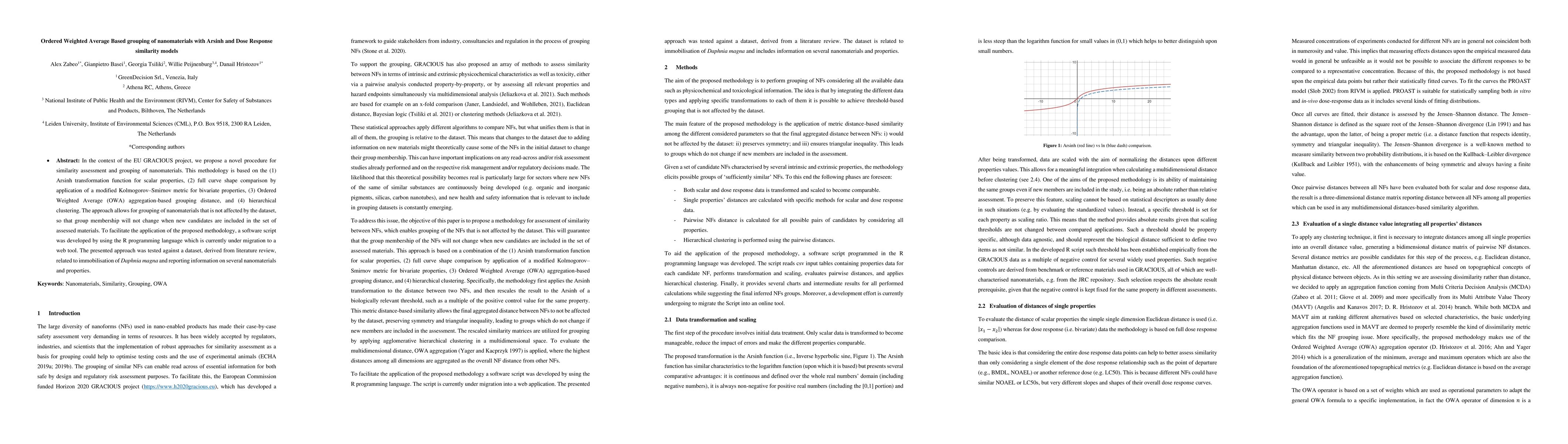 In the context of the EU GRACIOUS project, we propose a novel procedure for similarity assessment and grouping of nanomaterials. This methodology is based on the (1) Arsinh transformation function for scalar properties, (2) full curve shape comparison by application of a modified Kolmogorov-Smirnov metric for bivariate properties, (3) Ordered Weighted Average (OWA) aggregation-based grouping distance, and (4) hierarchical clustering. The approach allows for grouping of nanomaterials that is not affected by the dataset, so that group membership will not change when new candidates are included in the set of assessed materials. To facilitate the application of the proposed methodology, a software script was developed by using the R programming language which is currently under migration to a web tool. The presented approach was tested against a dataset, derived from literature review, related to immobilisation of Daphnia magna and reporting information on several nanomaterials.