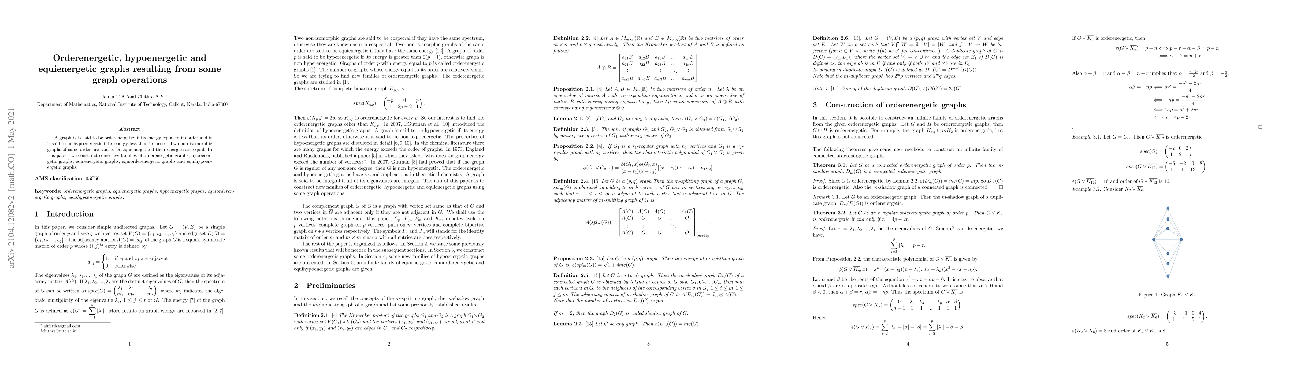 A graph G is said to be orderenergetic, if its energy equal to its order and it is said to be hypoenergetic if its energy less than its order. Two non-isomorphic graphs of same order are said to be equienergetic if their energies are equal. In this paper, we construct some new families of orderenergetic graphs, hypoenergetic graphs, equienergetic graphs, equiorderenergetic graphs and equihypoenergetic graphs.