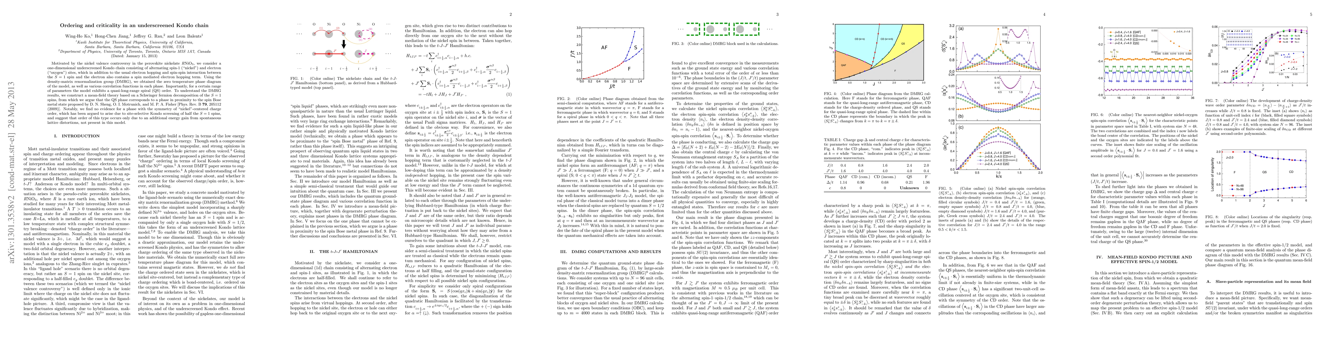 Motivated by the nickel valence controversy in the perovskite nickelate RNiO_3, we consider a one-dimensional underscreened Kondo chain consisting of alternating spin-1 ("nickel") and electron ("oxygen") sites, which in addition to the usual electron hopping and spin-spin interaction between the S=1 spin and the electron also contains a spin mediated electron hopping term. Using the density-matrix renormalization group (DMRG), we obtained the zero temperature phase diagram of the model, as well as various correlation functions in each phase. Importantly, for a certain range of parameters the model exhibits a quasi-long-range spiral (QS) order. To understand the DMRG results, we construct a mean-field theory based on a Schwinger fermion decomposition of the S=1 spins, from which we argue that the QS phase corresponds to a phase in proximity to the spin Bose metal state proposed by D. N. Sheng, O. I. Motrunich, and M. P. A. Fisher [Phys. Rev. B 79, 205112 (2009)]. Notably, we find no evidence for a phase with the symmetry of "nickel"-centered charge order, which has been argued to arise due to site-selective Kondo screening of half the S=1 spins, and suggest that order of this type occurs only due to an additional energy gain from spontaneous lattice distortions, not present in this model.