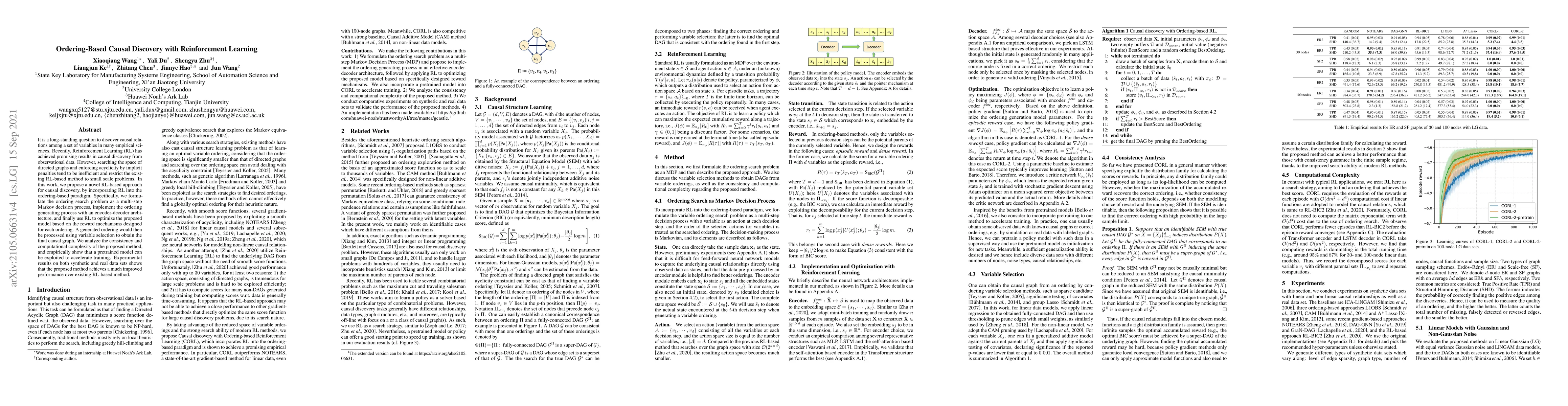 This paper proposes a novel Reinforcement Learning (RL) approach for causal discovery by integrating RL into the ordering-based paradigm, formulating the ordering search as a multi-step Markov decision process, and optimizing the model using RL-based reward mechanisms. The method demonstrates improved performance over existing RL-based methods on both synthetic and real datasets.