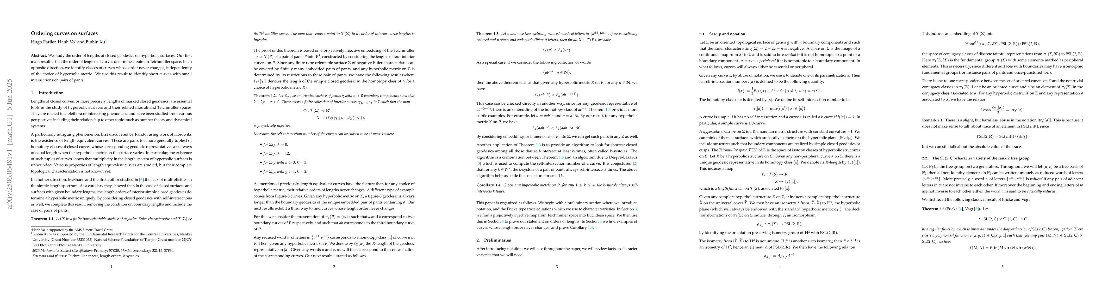 The paper introduces a method to associate the order of curve lengths with points in Teichmüller space and identifies classes of curves with invariant length order, providing a geometric insight into the structure of hyperbolic surfaces.