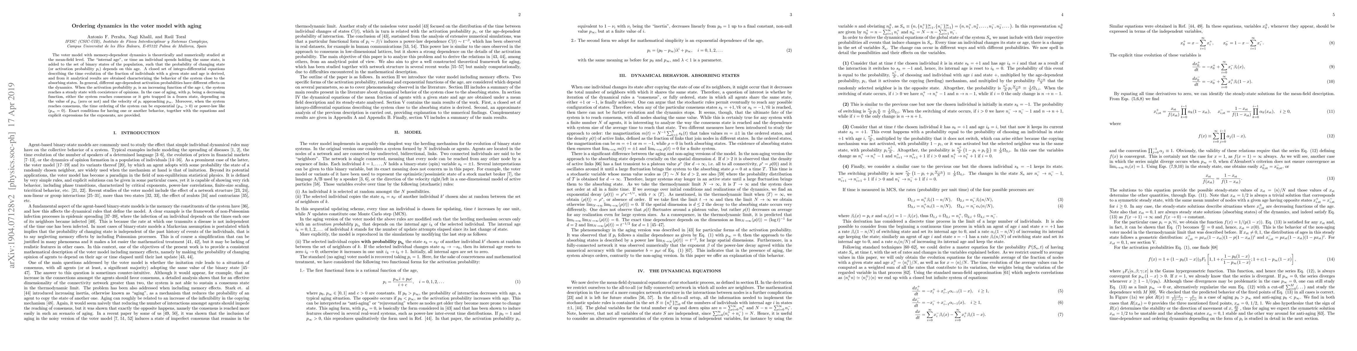 This research derives a set of integro-differential equations for a voter model with memory, showing how age-dependent activation probabilities affect system dynamics. With increasing activation probability tied to age, coexistence of opinions is achieved; decreasing probabilities lead to consensus or frozen states, depending on how quickly the system approaches a limiting probability. The study provides exact conditions for these outcomes and exponents governing the time to consensus, which can be exponential or power-law like.
