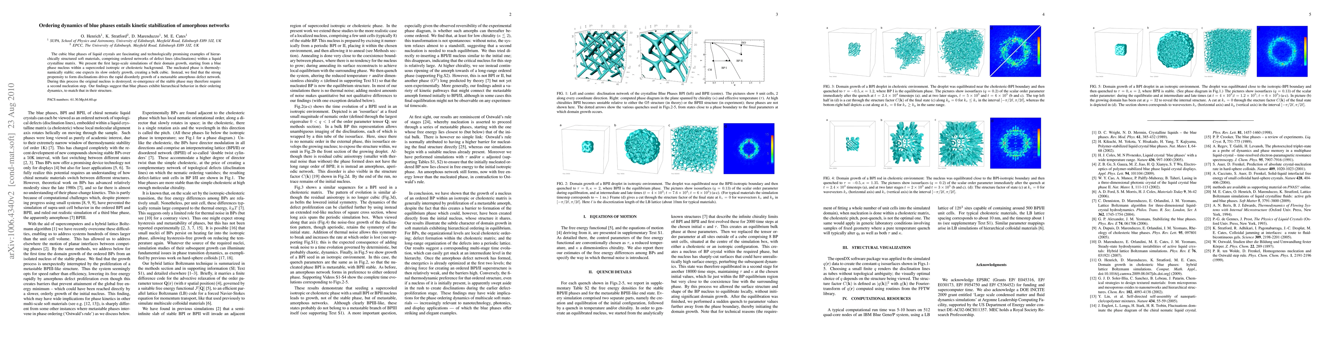 The cubic blue phases of liquid crystals are fascinating and technologically promising examples of hierarchically structured soft materials, comprising ordered networks of defect lines (disclinations) within a liquid crystalline matrix. We present the first large-scale simulations of their domain growth, starting from a blue phase nucleus within a supercooled isotropic or cholesteric background. The nucleated phase is thermodynamically stable; one expects its slow orderly growth, creating a bulk cubic. Instead, we find that the strong propensity to form disclinations drives the rapid disorderly growth of a metastable amorphous defect network. During this process the original nucleus is destroyed; re-emergence of the stable phase may therefore require a second nucleation step. Our findings suggest that blue phases exhibit hierarchical behavior in their ordering dynamics, to match that in their structure.