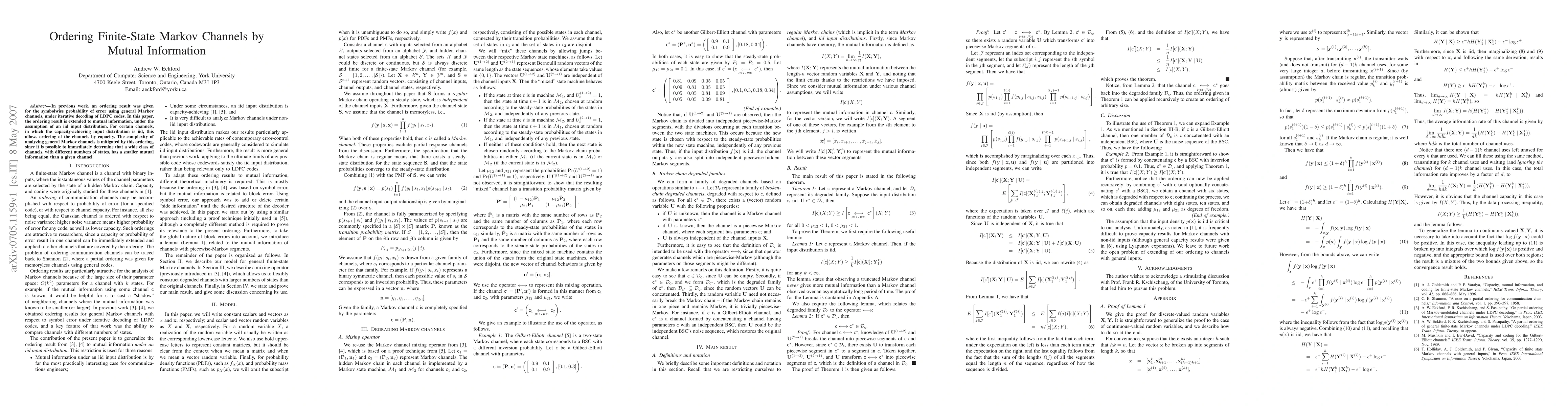 In previous work, an ordering result was given for the symbolwise probability of error using general Markov channels, under iterative decoding of LDPC codes. In this paper, the ordering result is extended to mutual information, under the assumption of an iid input distribution. For certain channels, in which the capacity-achieving input distribution is iid, this allows ordering of the channels by capacity. The complexity of analyzing general Markov channels is mitigated by this ordering, since it is possible to immediately determine that a wide class of channels, with different numbers of states, has a smaller mutual information than a given channel.