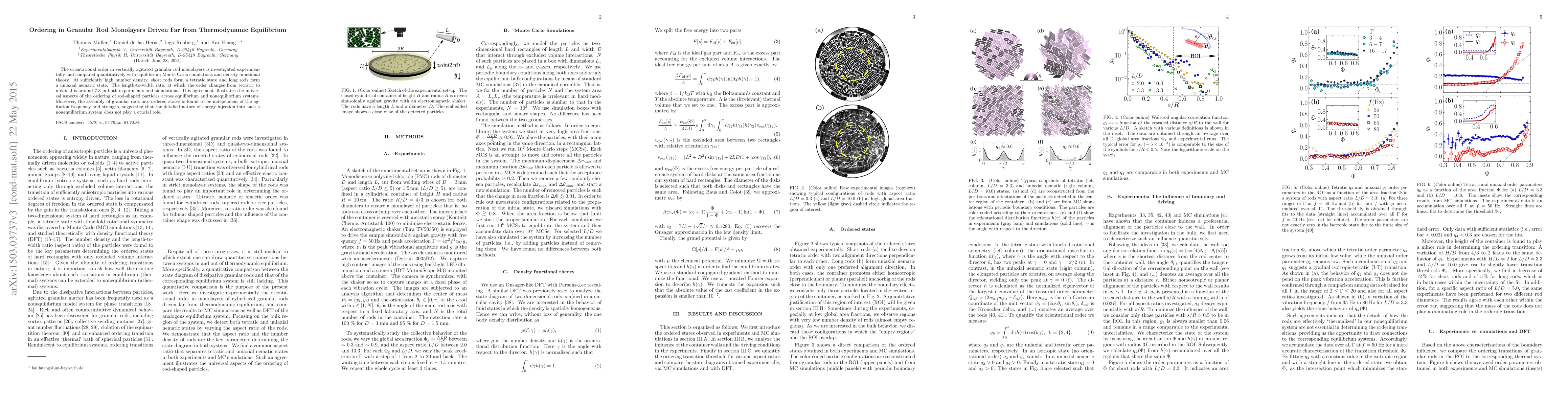 This paper investigates experimentally and simulates the orientational order in granular rod monolayers driven far from thermodynamic equilibrium, finding that short rods form a tetratic state while long rods form a uniaxial nematic state at high densities. The transition ratio between these states is consistent across both experiments and simulations, highlighting universal ordering principles in nonequilibrium systems.