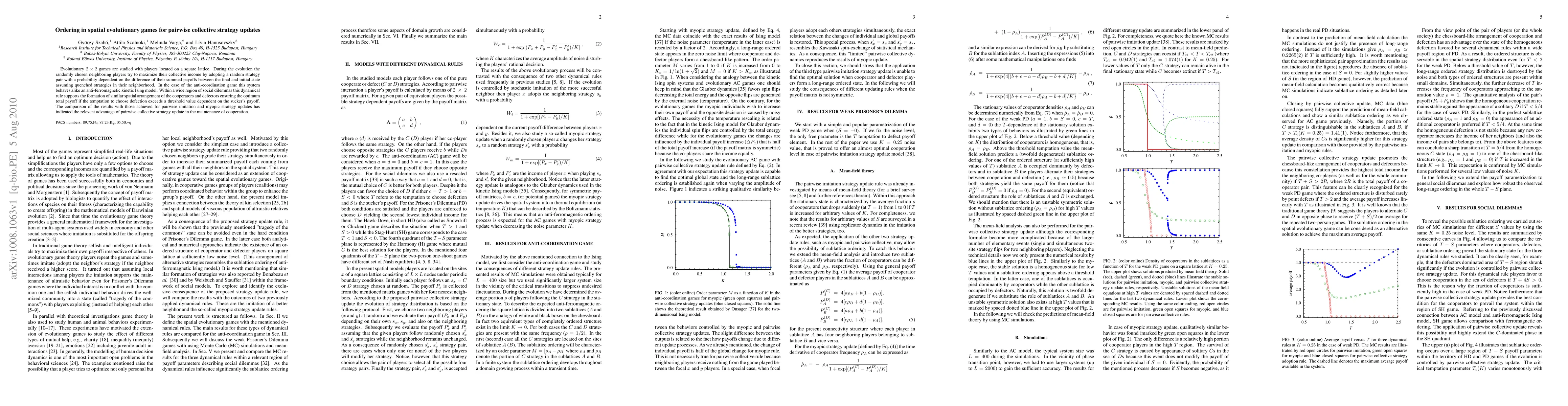 Evolutionary $2 \times 2$ games are studied with players located on a square lattice. During the evolution the randomly chosen neighboring players try to maximize their collective income by adopting a random strategy pair with a probability dependent on the difference of their summed payoffs between the final and initial state assuming quenched strategies in their neighborhood. In the case of the anti-coordination game this system behaves alike an anti-ferromagnetic kinetic Ising model. Within a wide region of social dilemmas this dynamical rule supports the formation of similar spatial arrangement of the cooperators and defectors ensuring the optimum total payoff if the temptation to choose defection exceeds a threshold value dependent on the sucker's payoff. The comparison of the results with those achieved for pairwise imitation and myopic strategy updates has indicated the relevant advantage of pairwise collective strategy update in the maintenance of cooperation.
