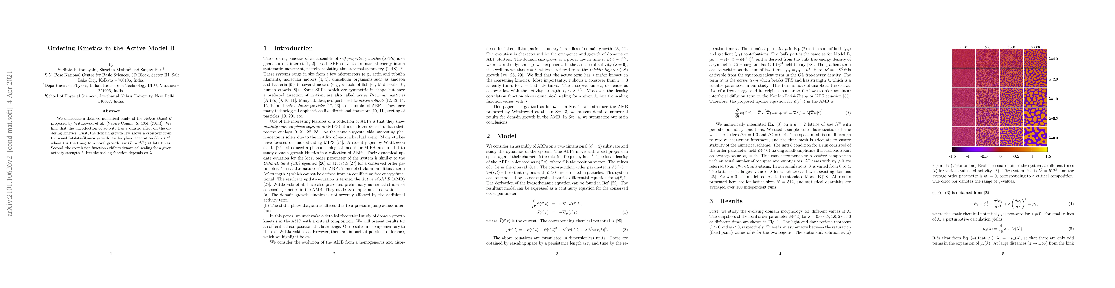 We undertake a detailed numerical study of the {\it Active Model B} proposed by Wittkowski et al. [Nature Comm. {\bf 5}, 4351 (2014)]. We find that the introduction of activity has a drastic effect on the ordering kinetics. First, the domain growth law shows a crossover from the usual Lifshitz-Slyozov growth law for phase separation ($L \sim t^{1/3}$, where $t$ is the time) to a novel growth law ($L \sim t^{1/4}$) at late times. Second, the correlation function exhibits dynamical scaling for a given activity strength $\lambda$, but the scaling function depends on $\lambda$.
